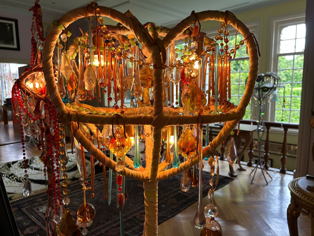 Tripod standing lamp made of welded iron, covered in dyed silk velvet, decorated with collected vintage glass and ceramics.