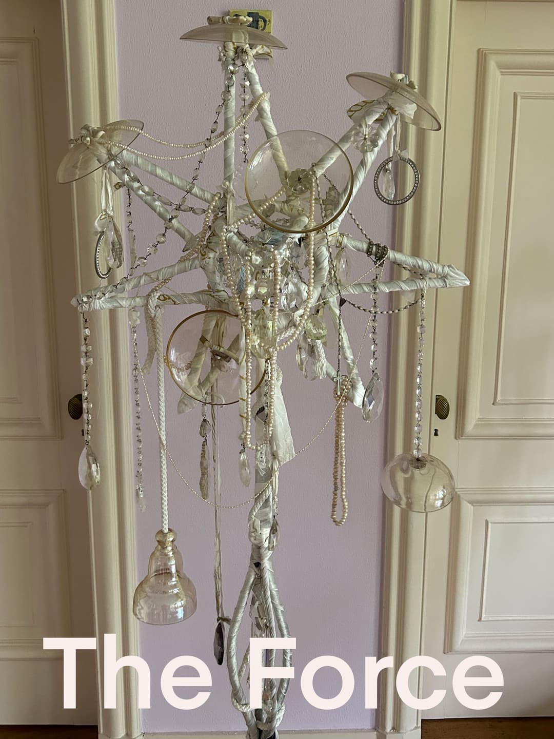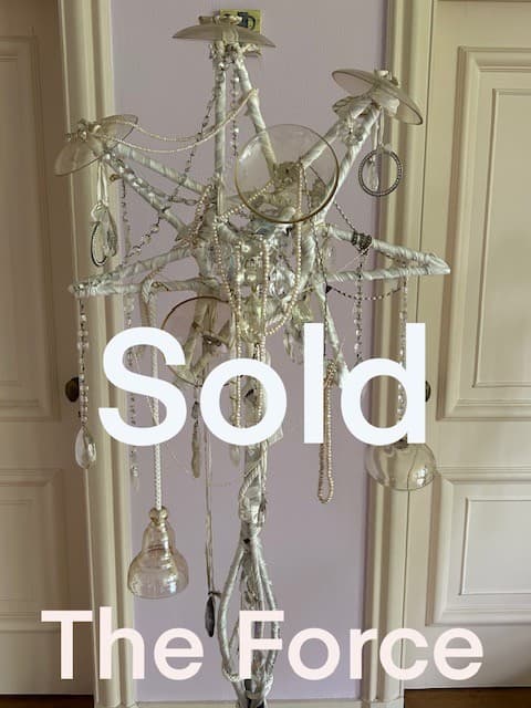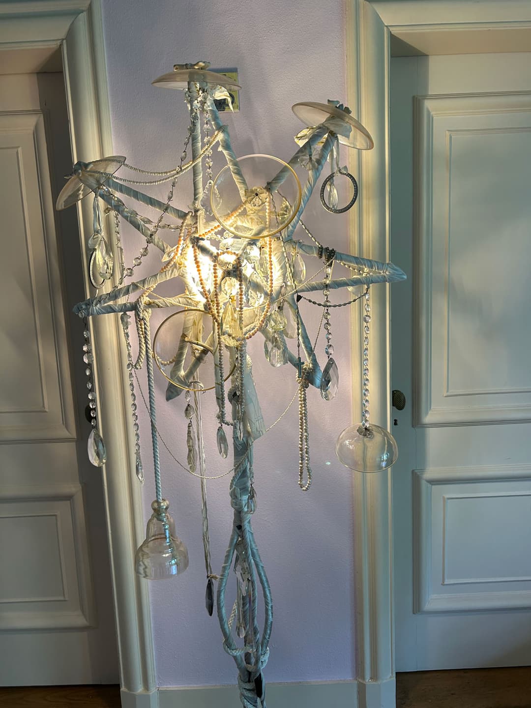 Tripod standing lamp made of welded iron, covered in dyed silk velvet, decorated with collected vintage glass and ceramics.