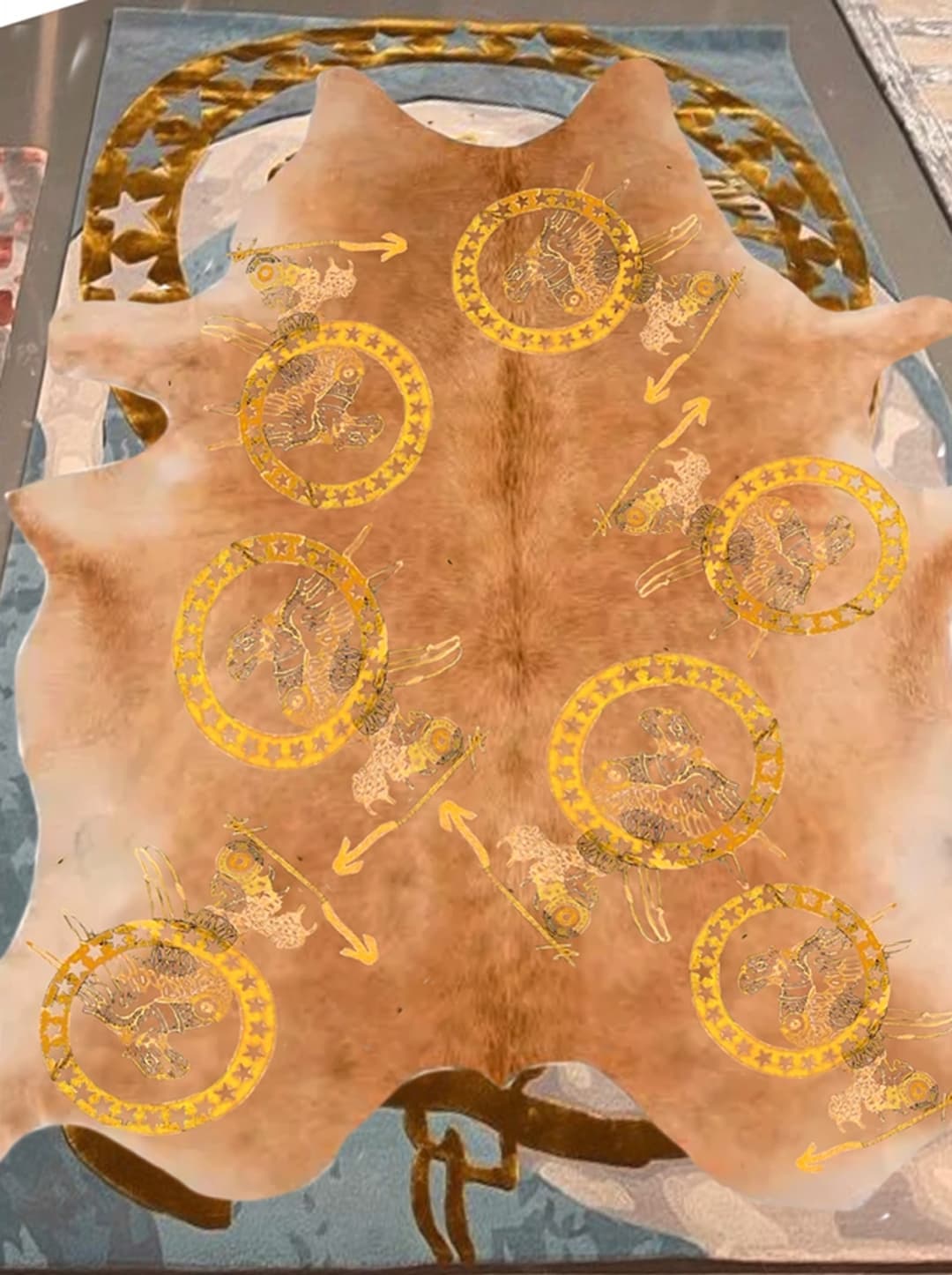 Hand printed on cowhide. Use it as a carpet or hang it on the wall as an artwork. Every piece is unique. This is a natural product therefore colour or print can differ slightly.