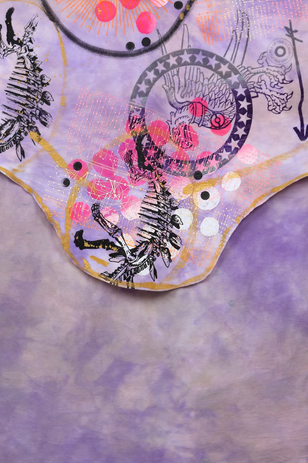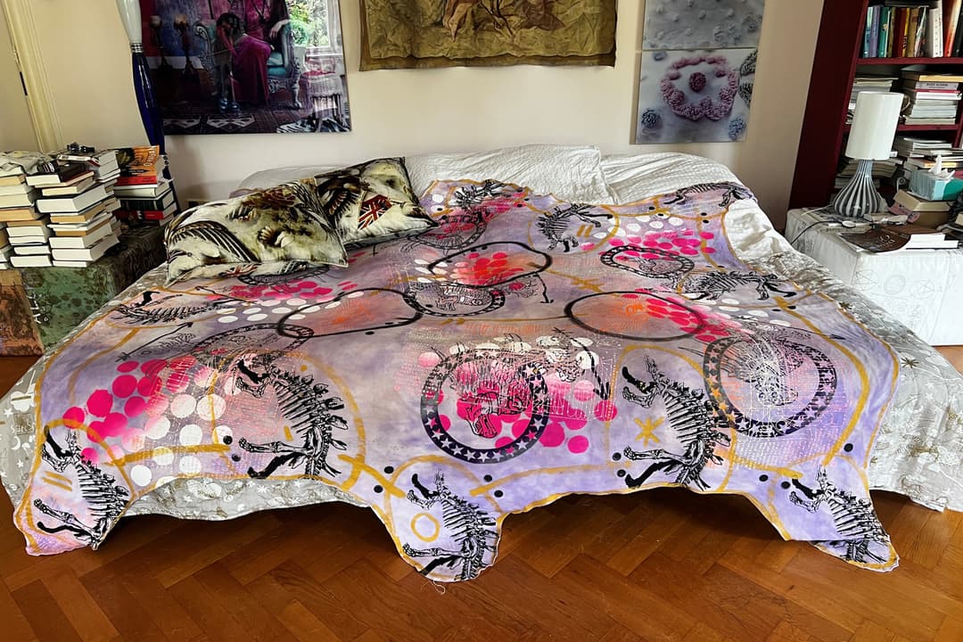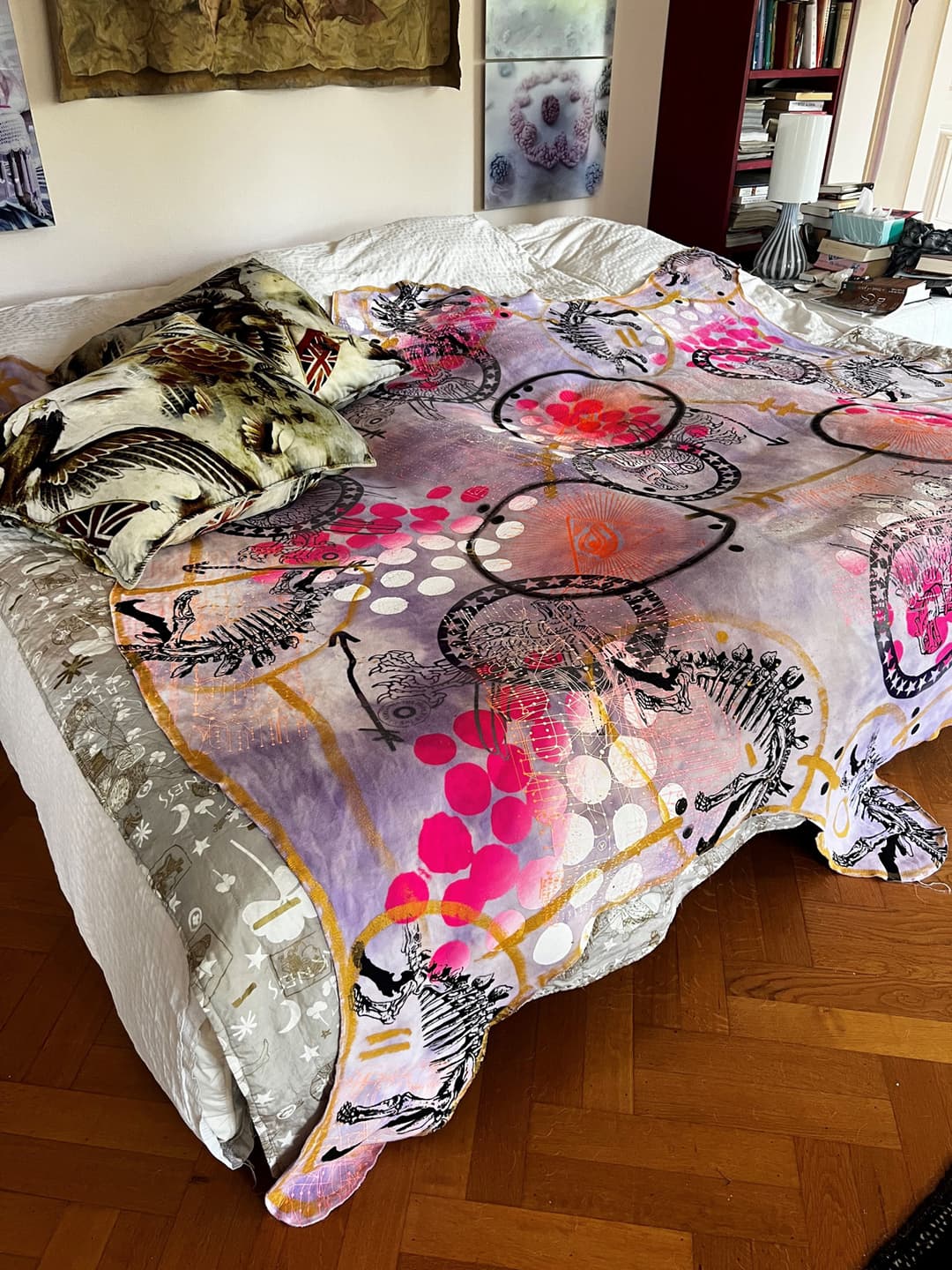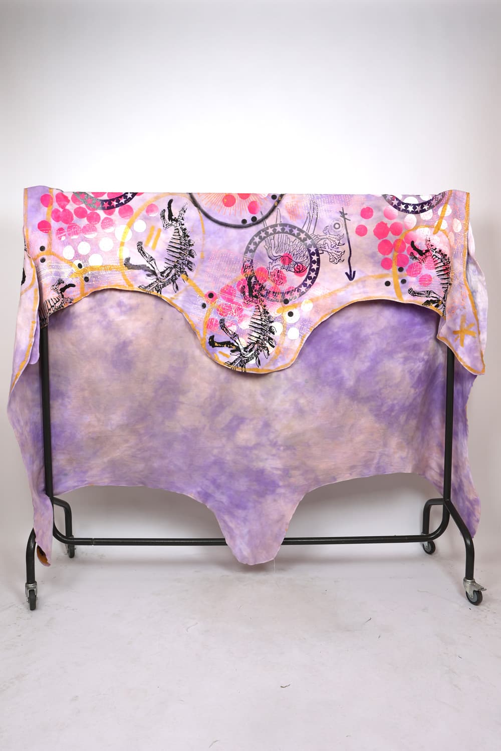 Hand dyed and printed roughened cotton art piece in the shape of an animal skin. Throw it on your bed, sofa or hang it on the wall as an artwork. Every piece is unique.