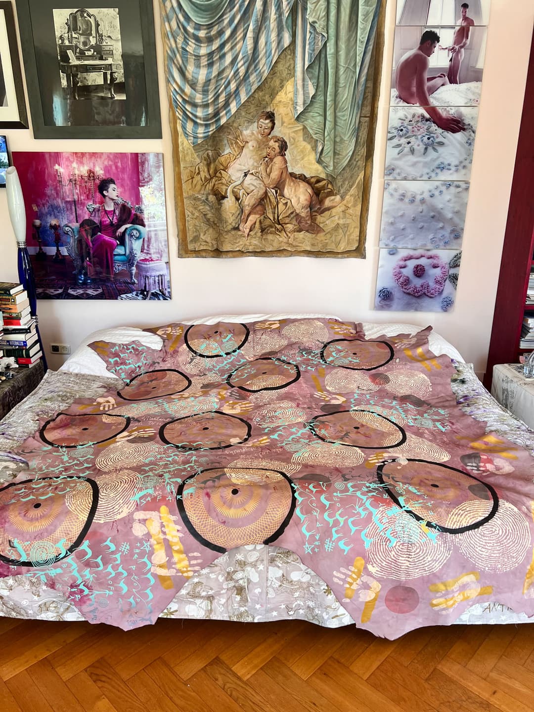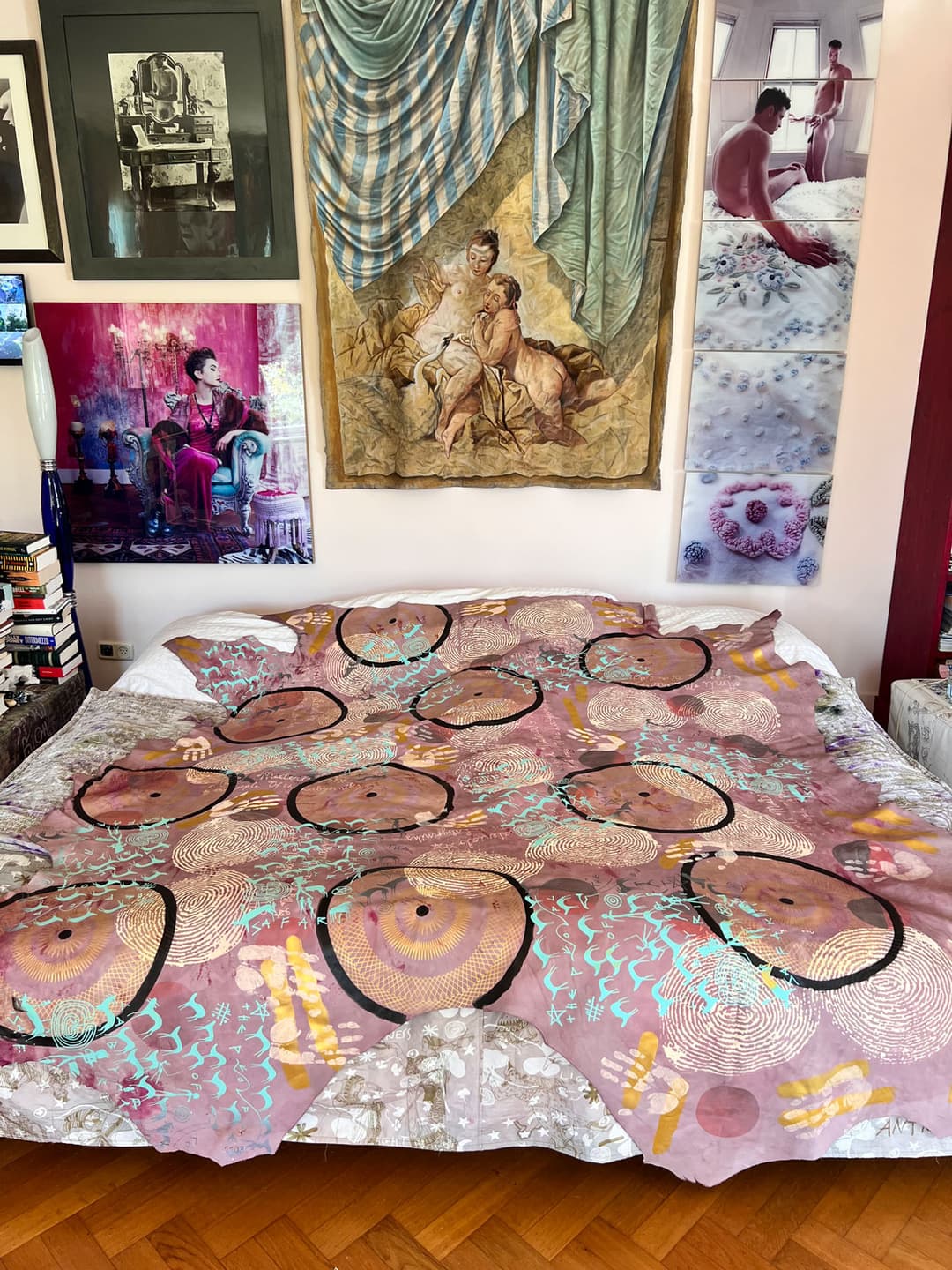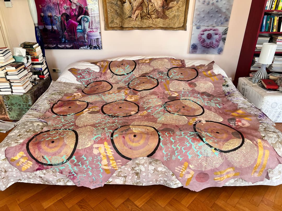 Hand printed on cowhide. Throw it over your bed or hang it on the wall as an artwork. Every piece is unique.
