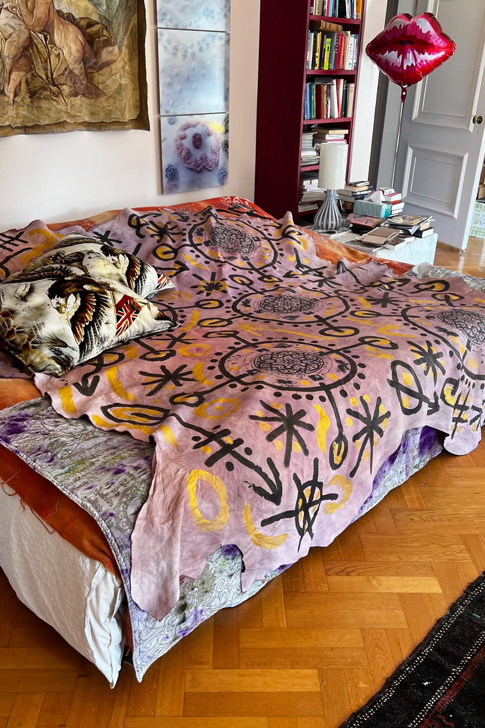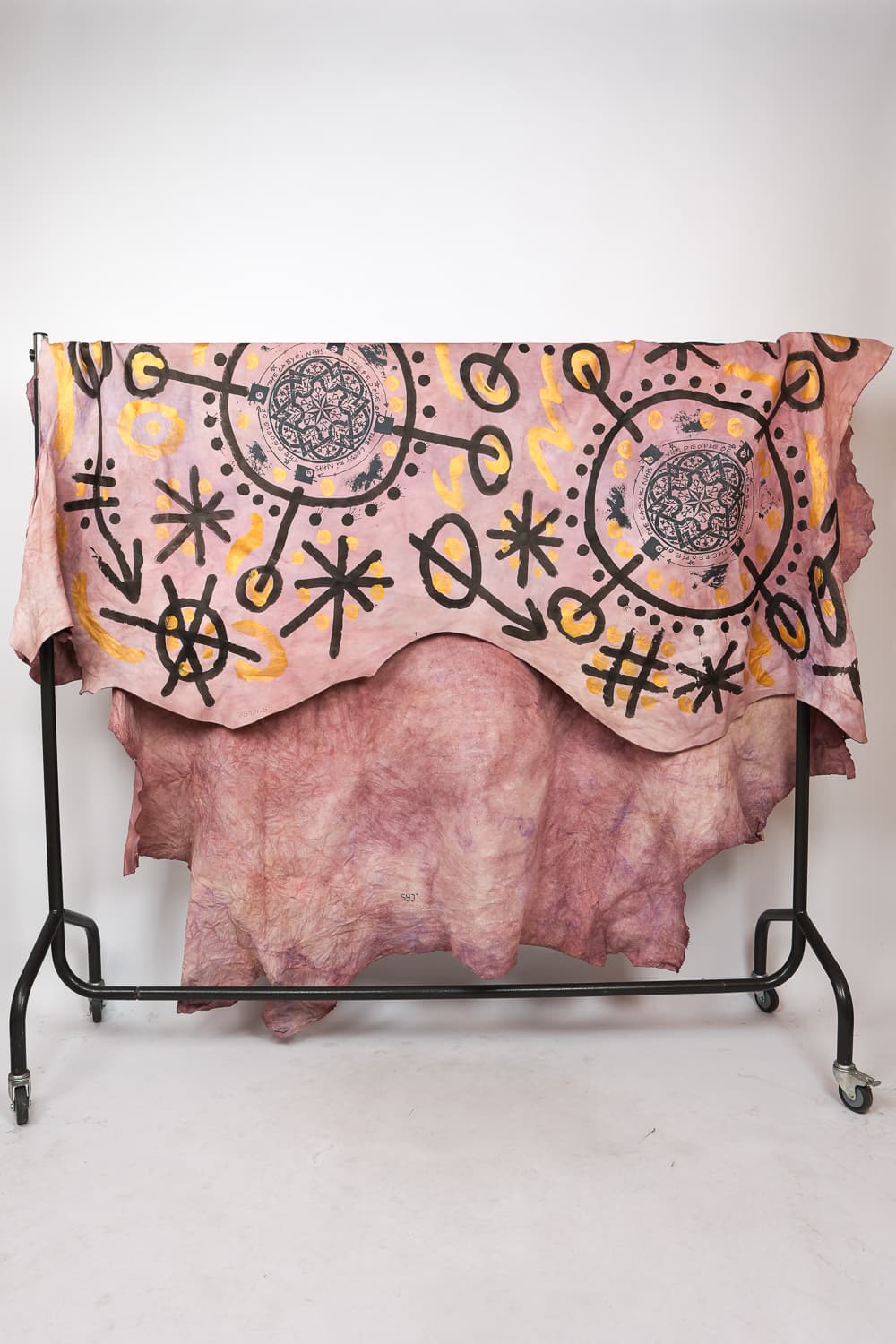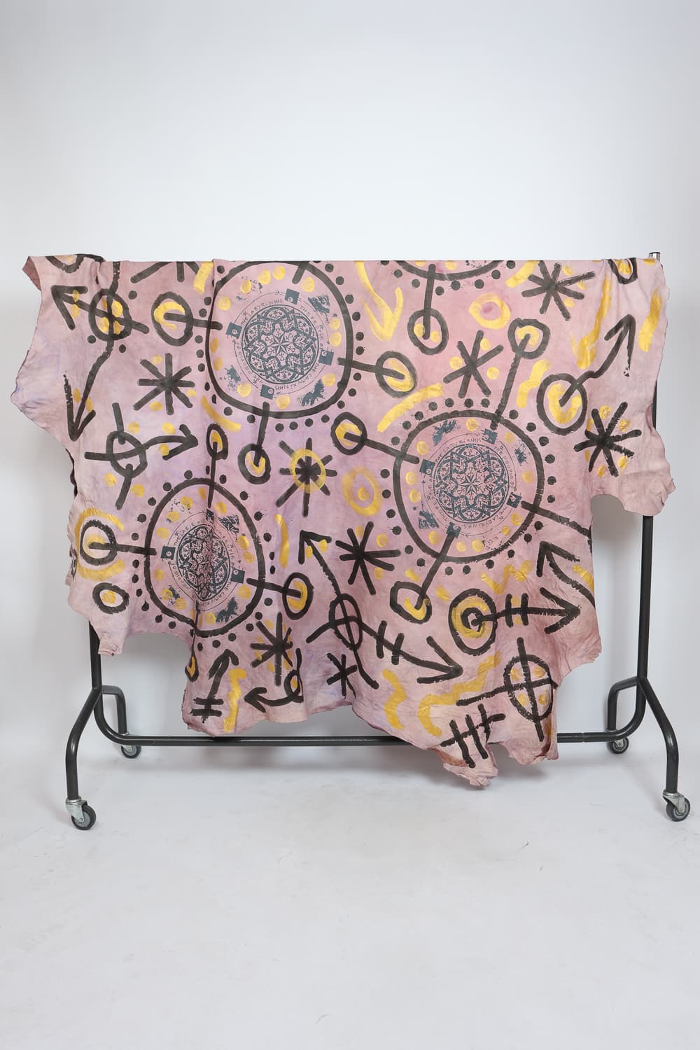 Hand dyed and printed on a leather hide. Throw it on your bed, sofa or hang it on the wall as an artwork. Every piece is unique.