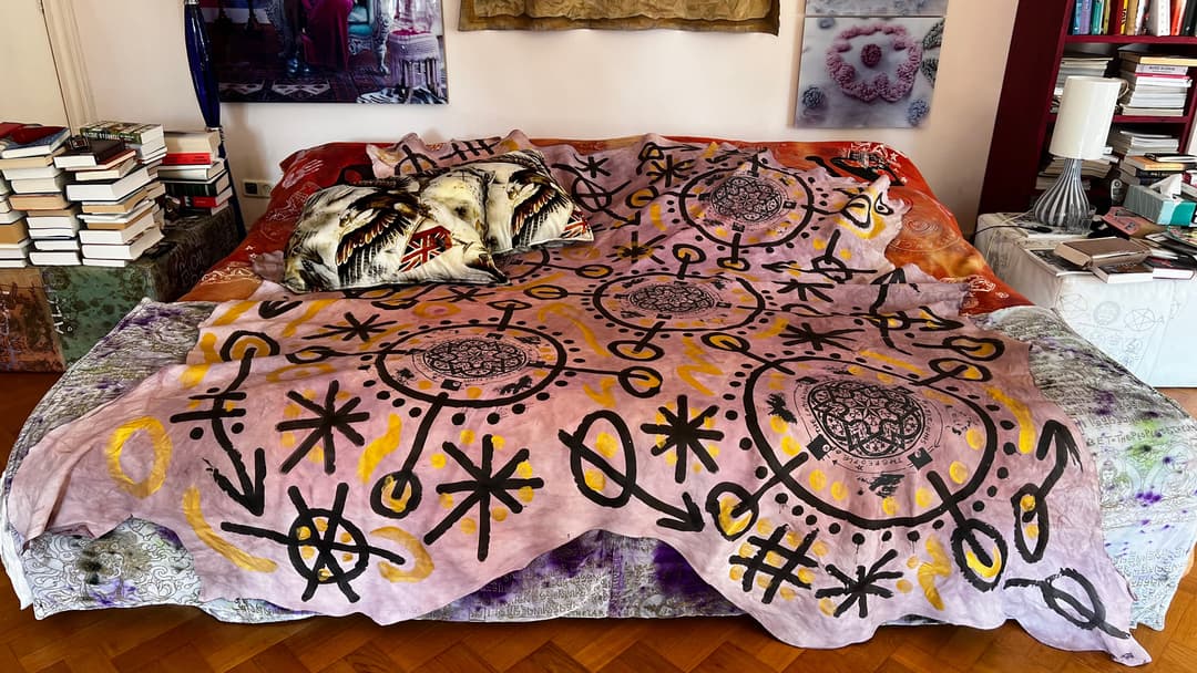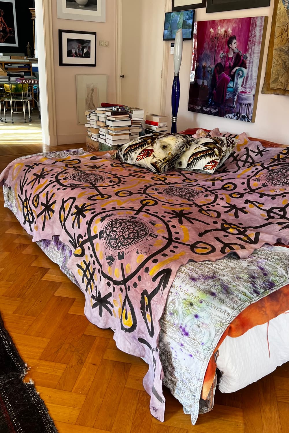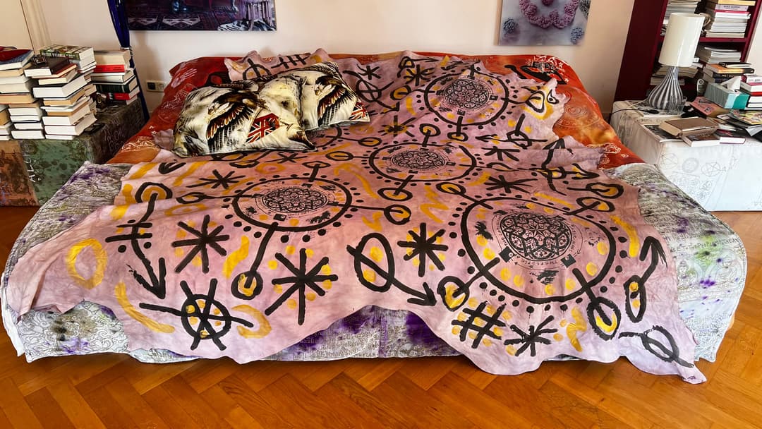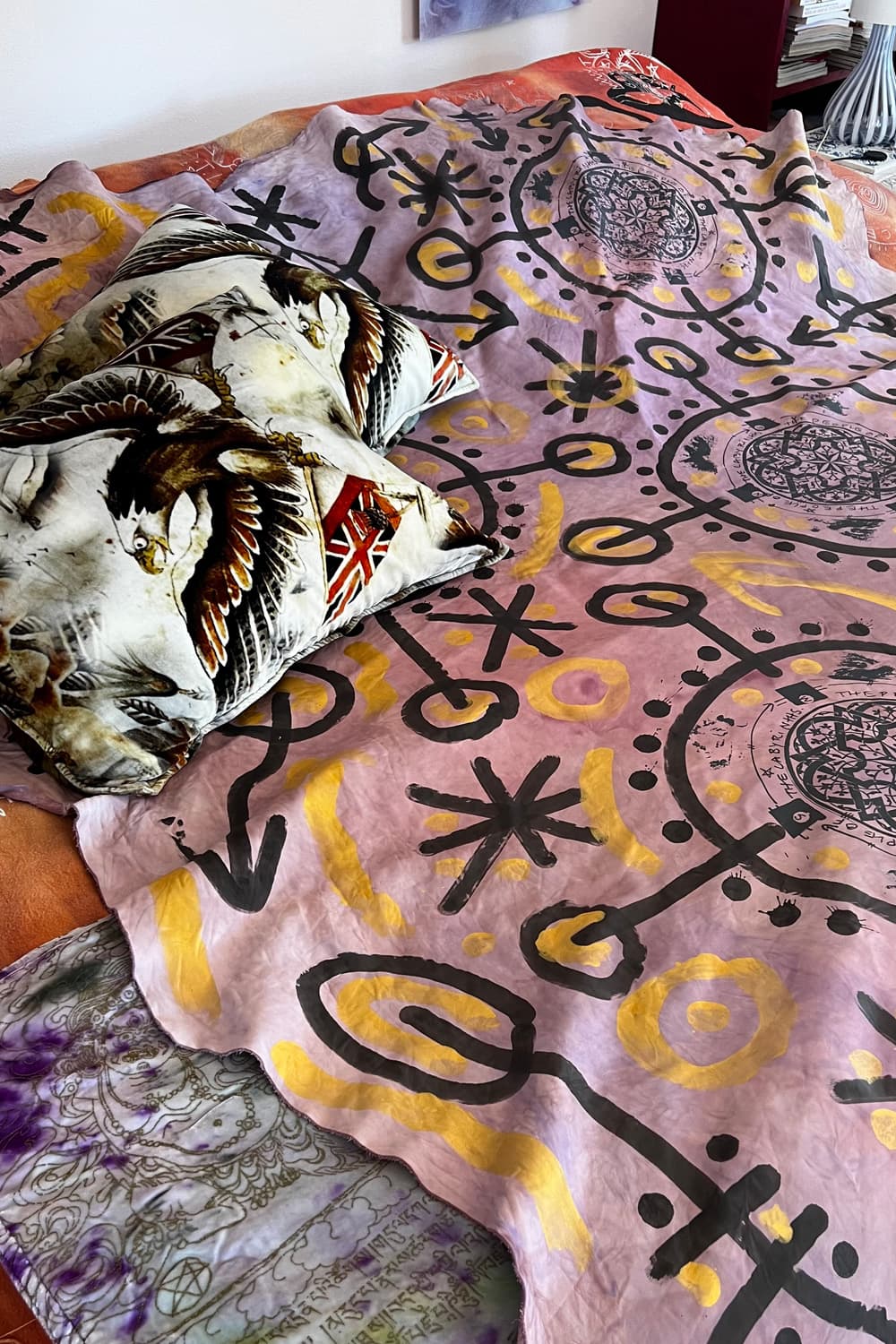 Hand dyed and printed on a leather hide. Throw it on your bed, sofa or hang it on the wall as an artwork. Every piece is unique.