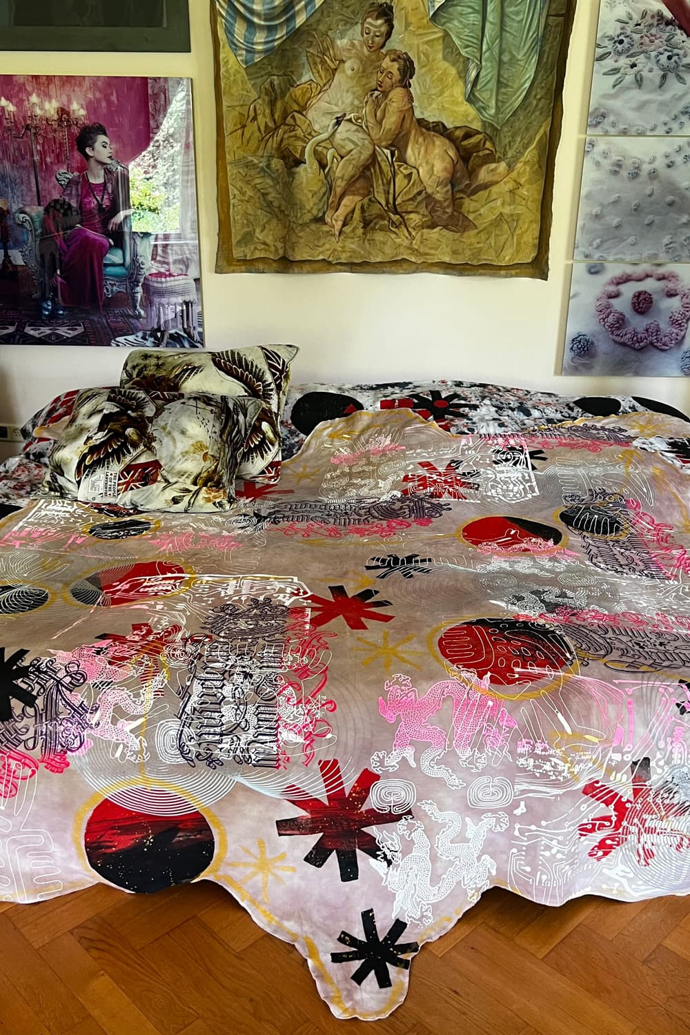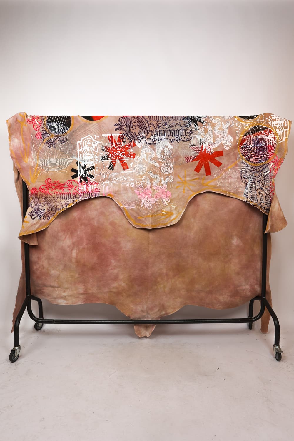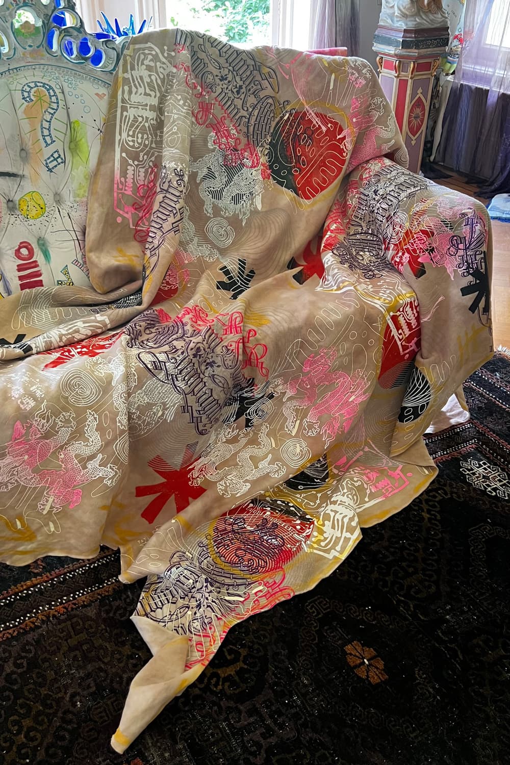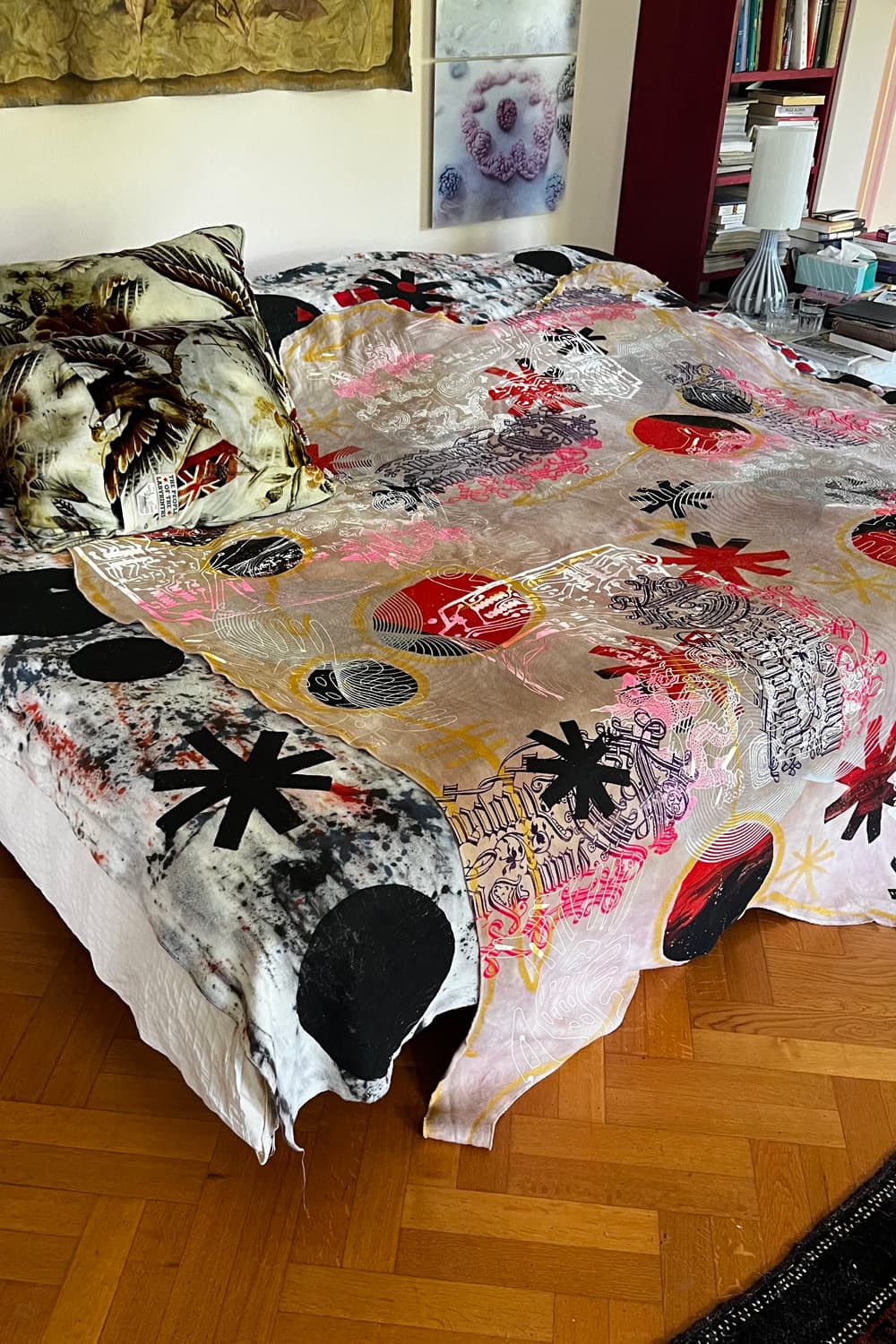 Hand dyed and printed on rough cotton molton. Throw it on your bed, sofa or hang it on the wall as an artwork. Every piece is unique.