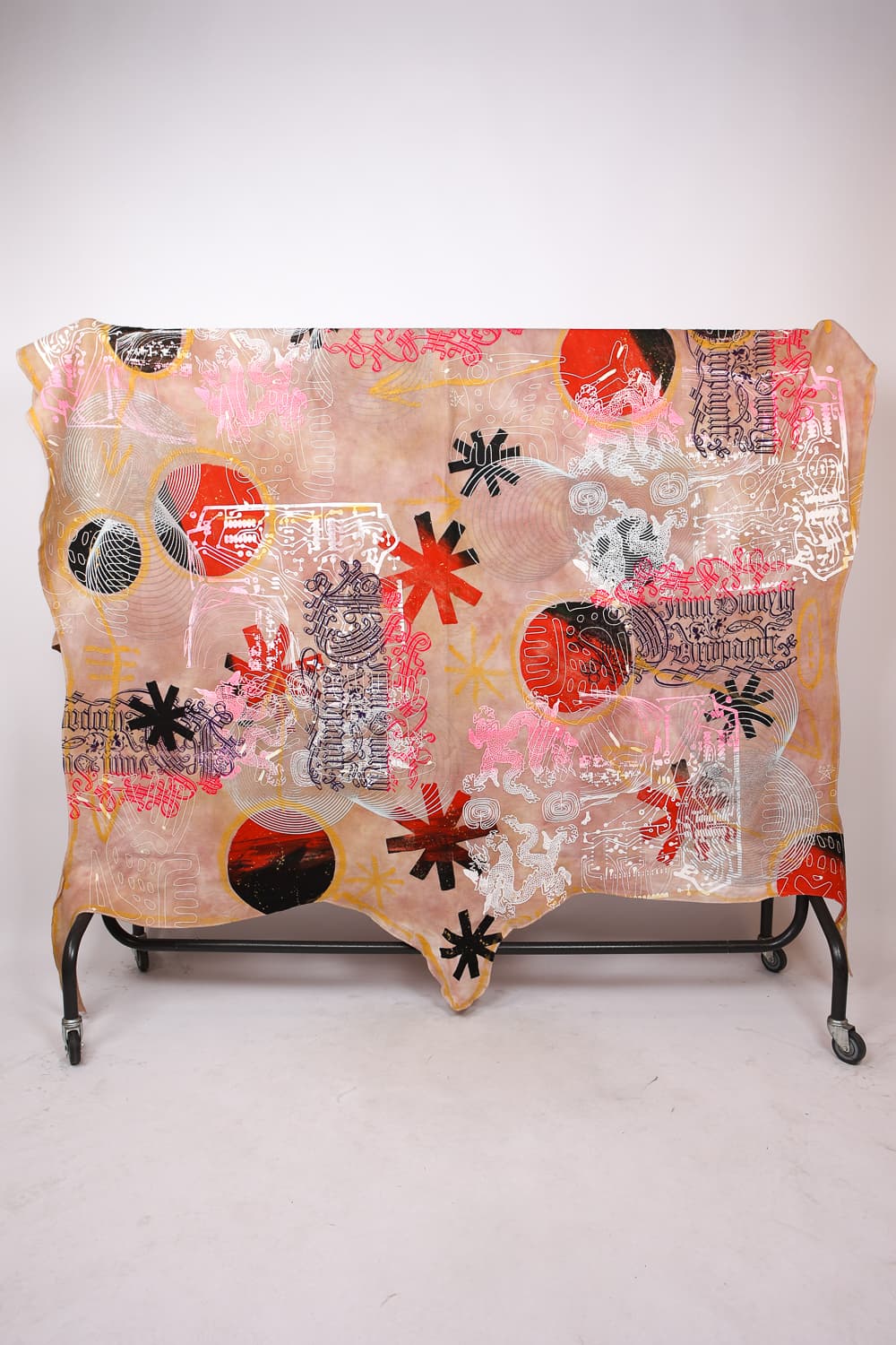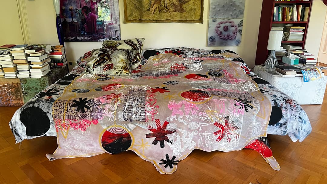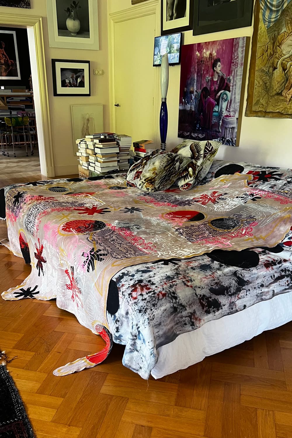 Hand dyed and printed on rough cotton molton. Throw it on your bed, sofa or hang it on the wall as an artwork. Every piece is unique.