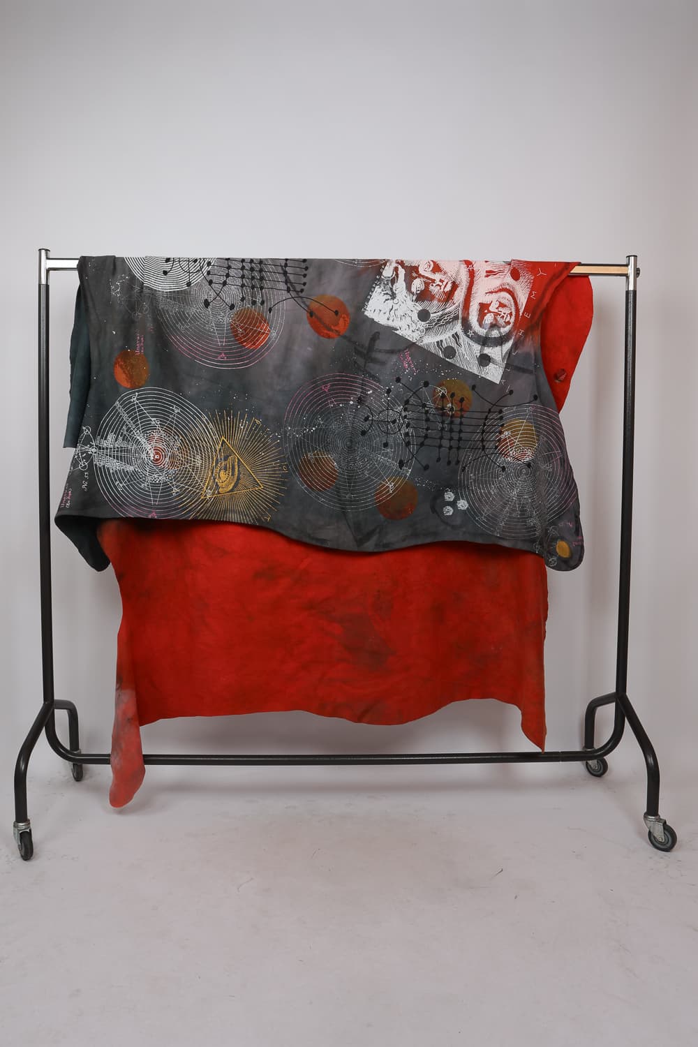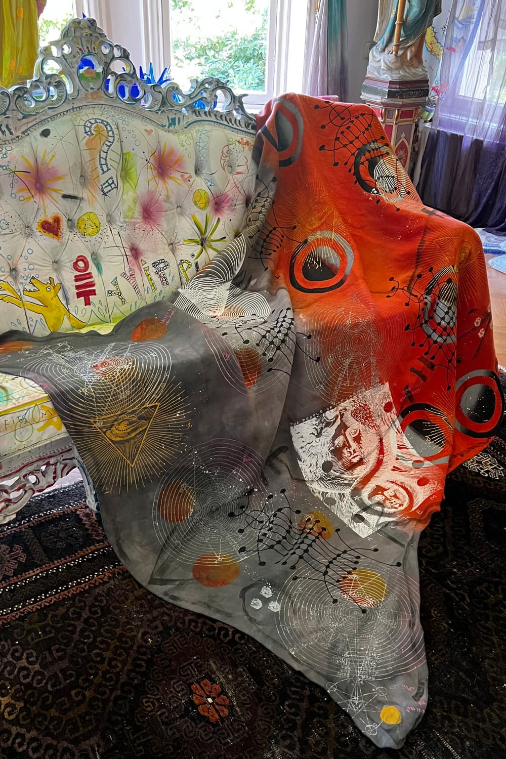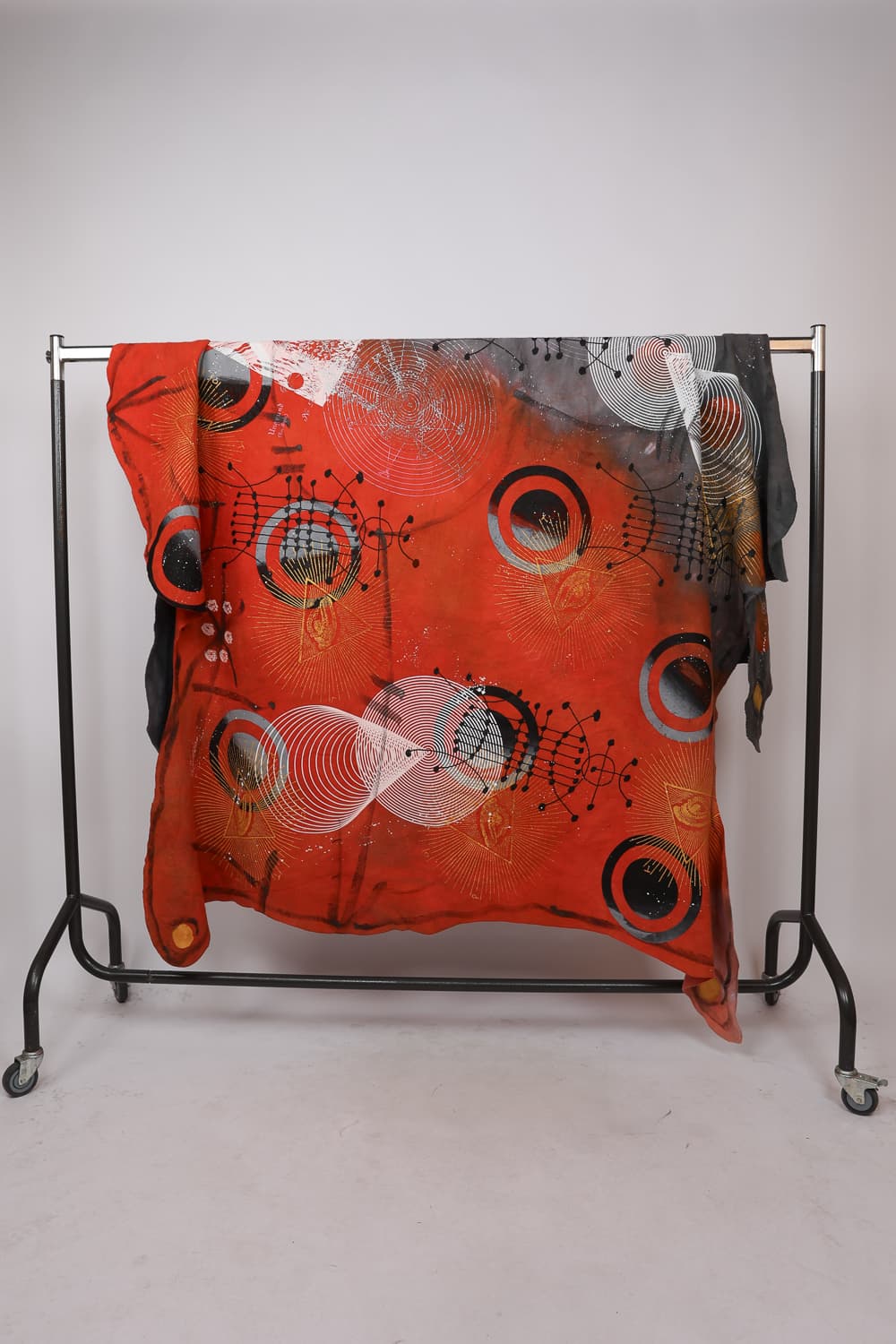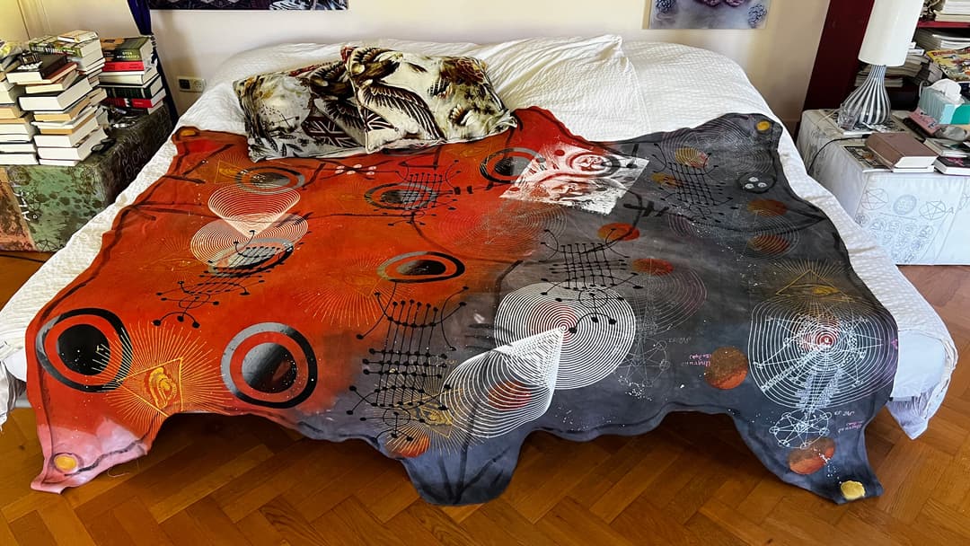 Hand dyed and printed on rough cotton molton. Throw it on your bed, sofa or hang it on the wall as an artwork. Every piece is unique.