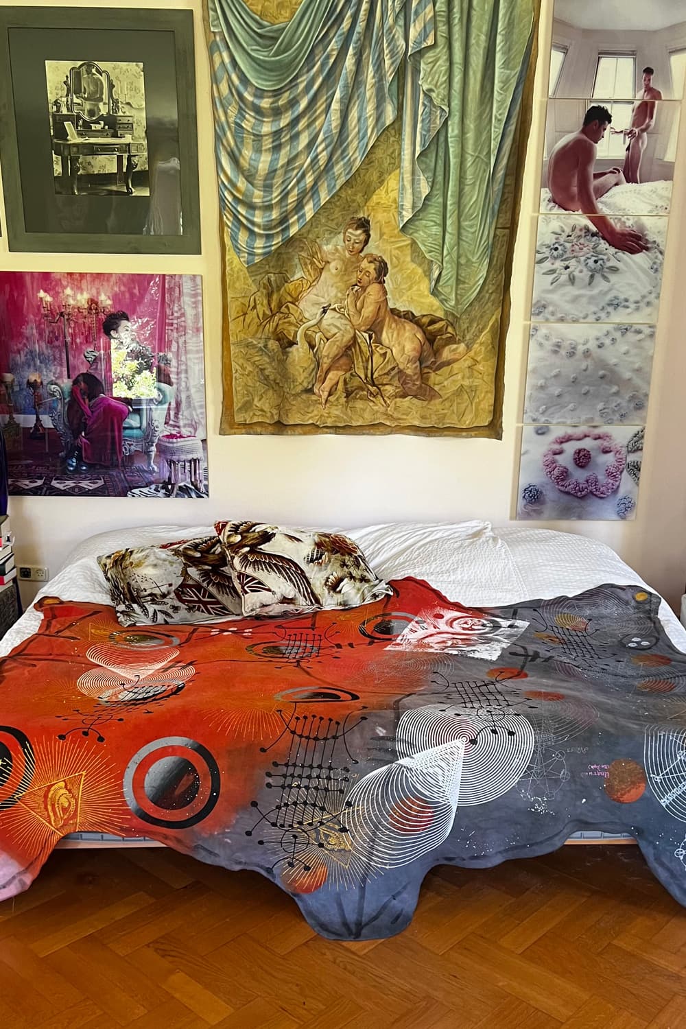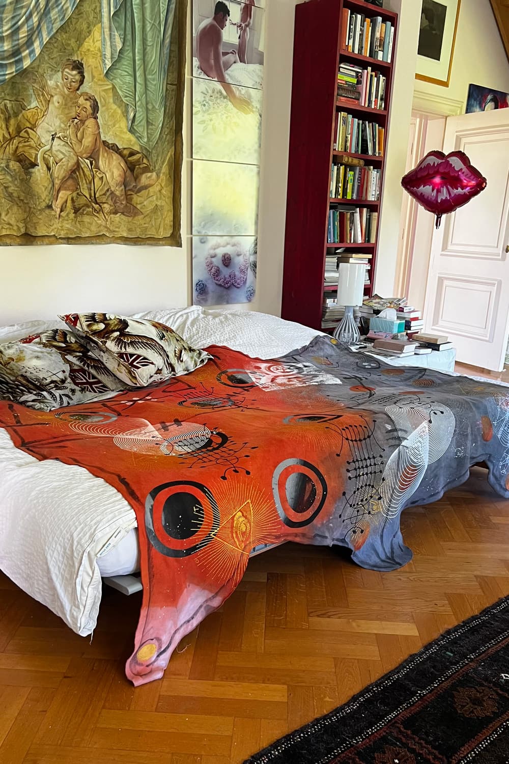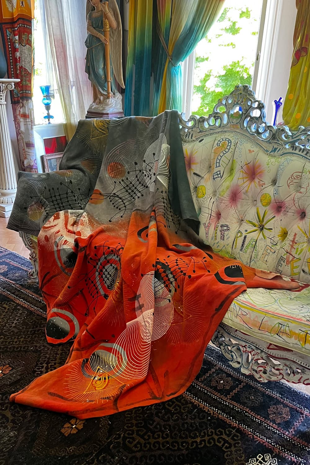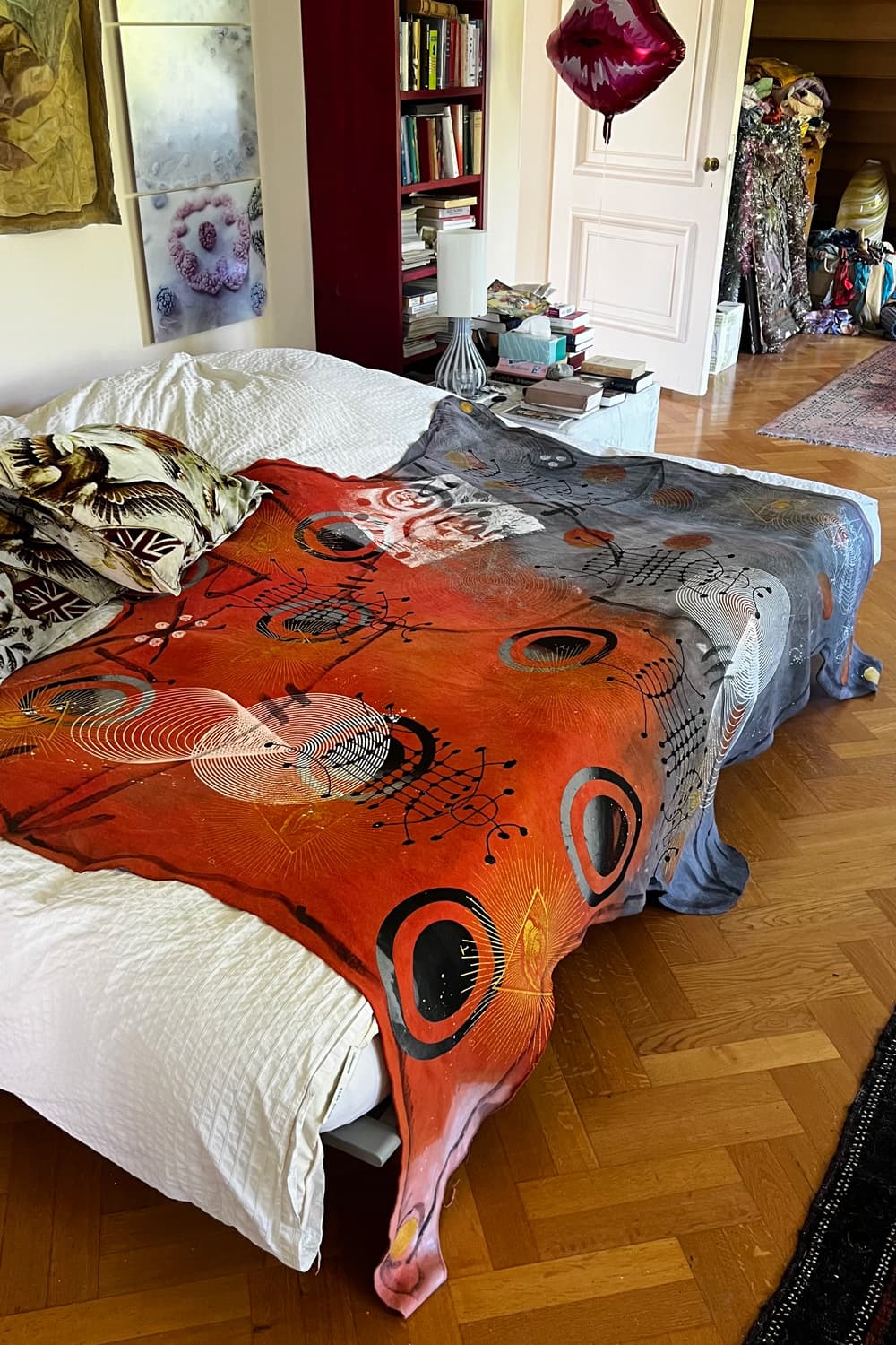 Hand dyed and printed on rough cotton molton. Throw it on your bed, sofa or hang it on the wall as an artwork. Every piece is unique.