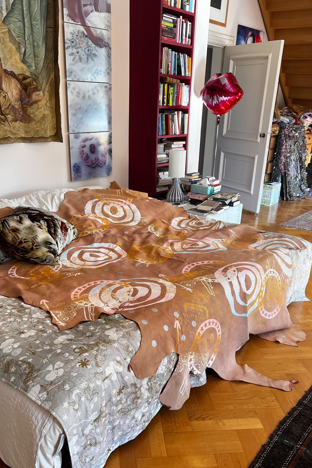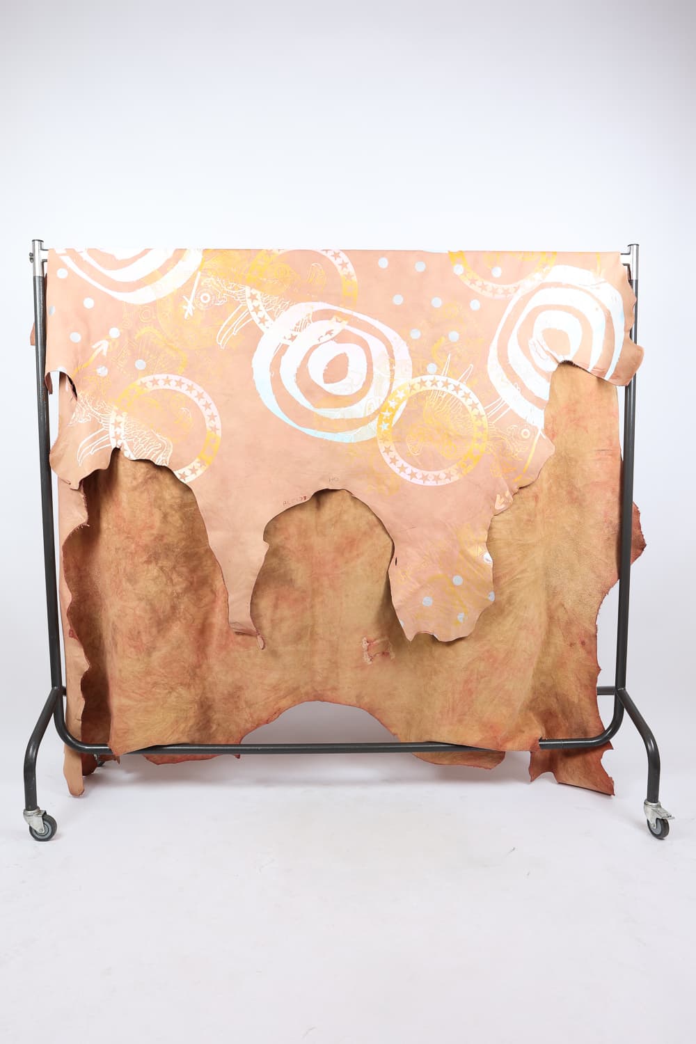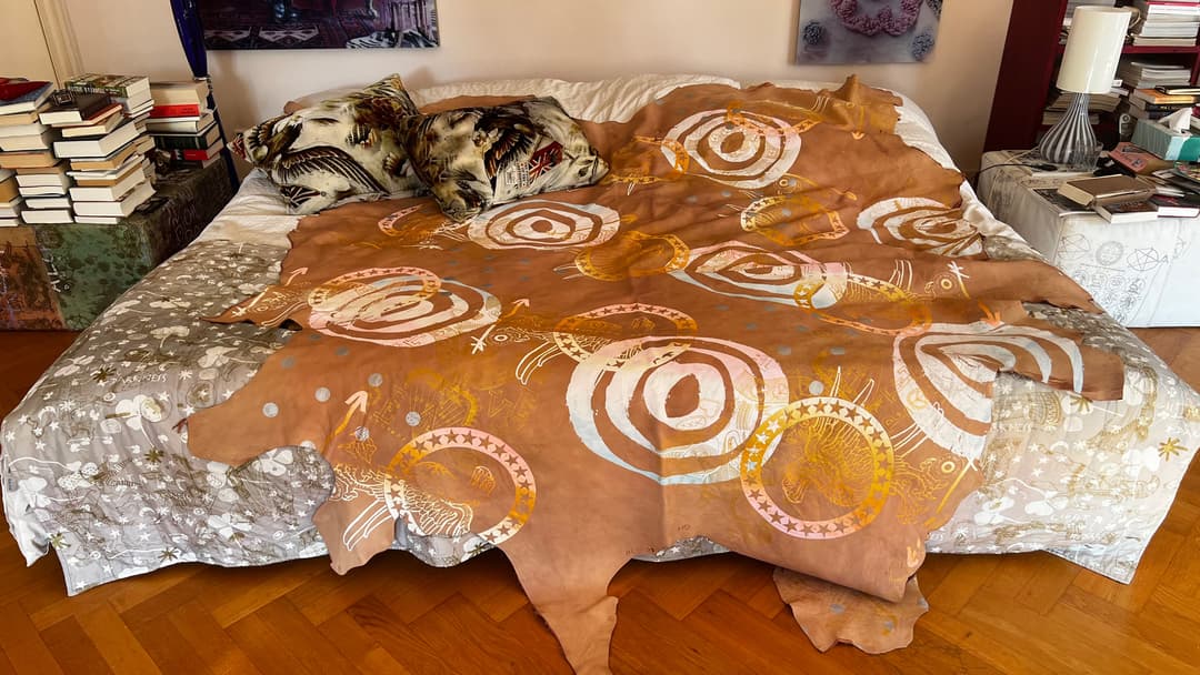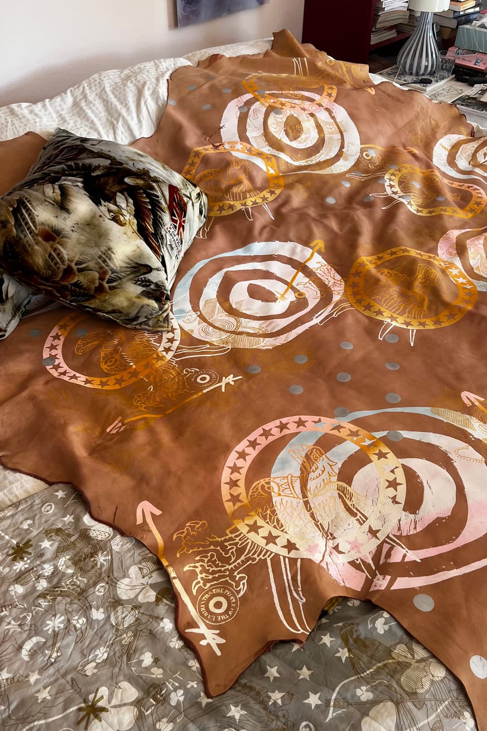 Hand dyed and printed on a leather hide. Throw it on your bed, sofa or hang it on the wall as an artwork. Every piece is unique.