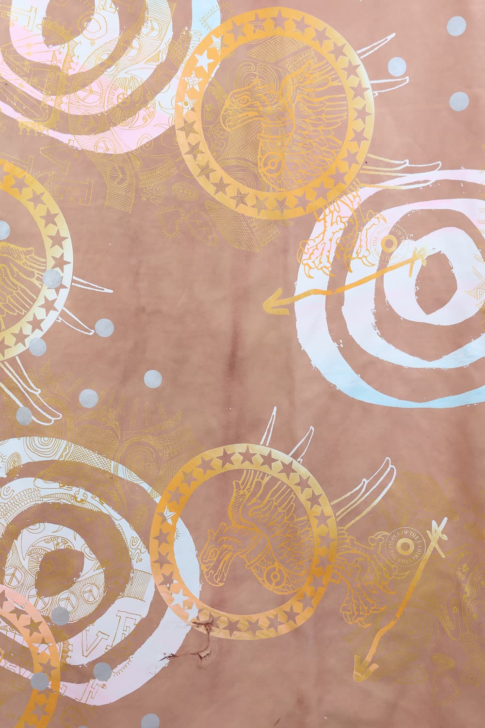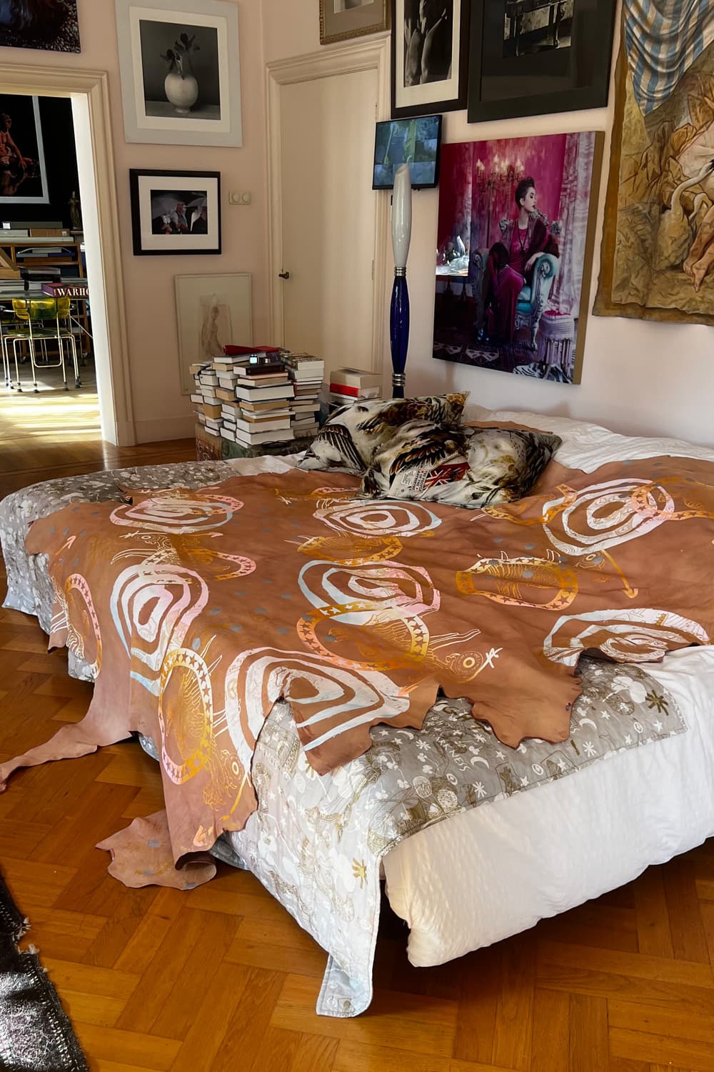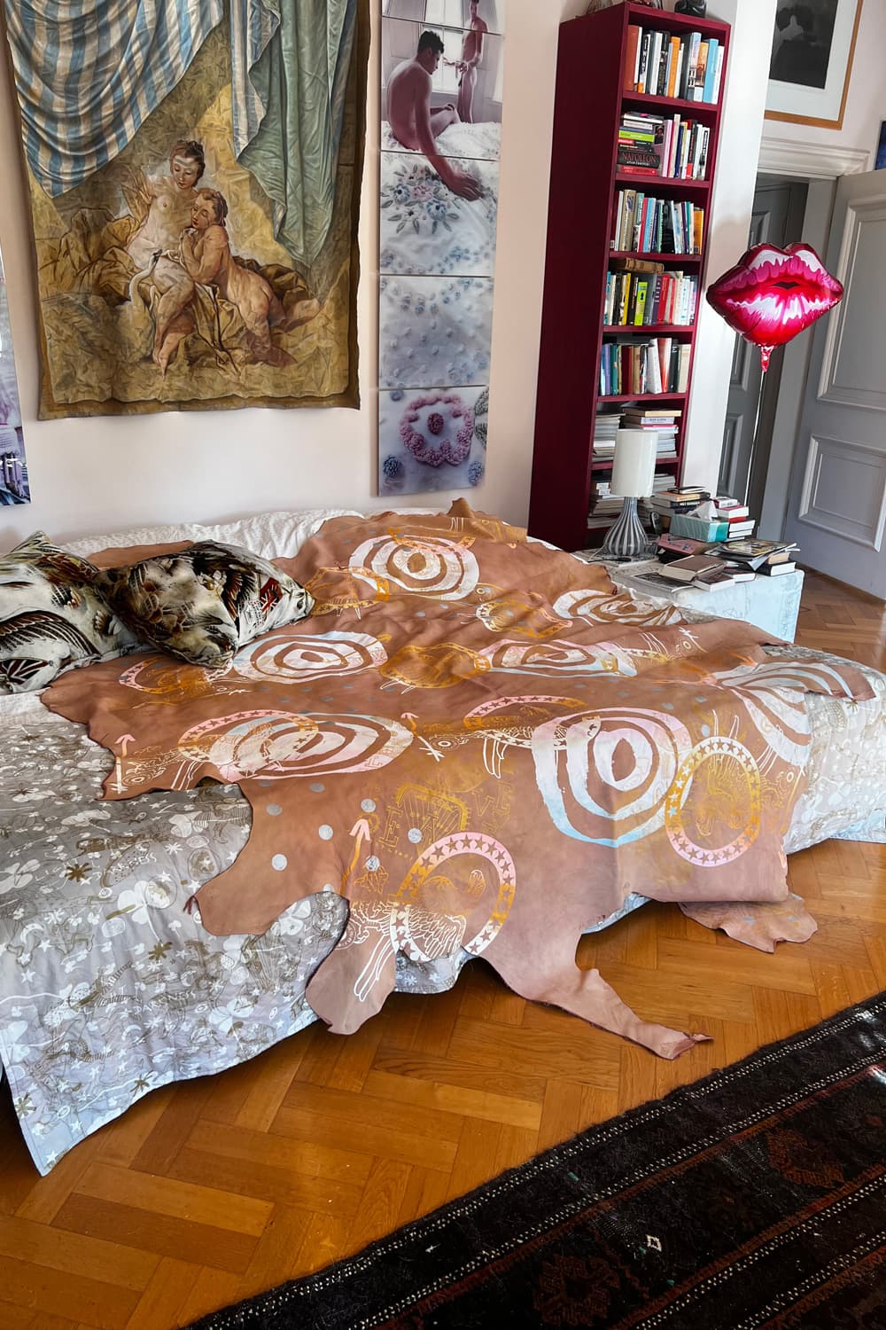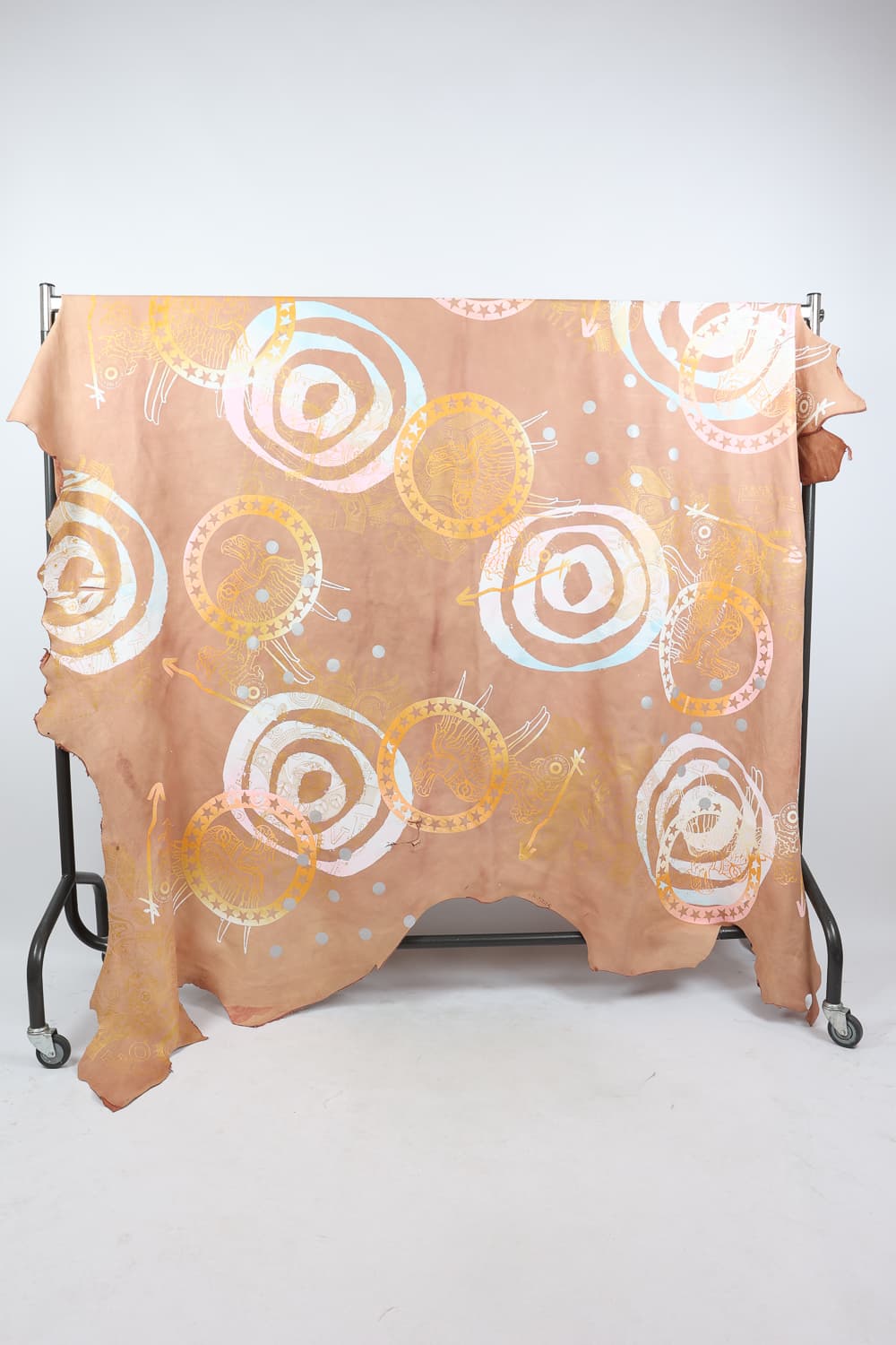 Hand dyed and printed on a leather hide. Throw it on your bed, sofa or hang it on the wall as an artwork. Every piece is unique.