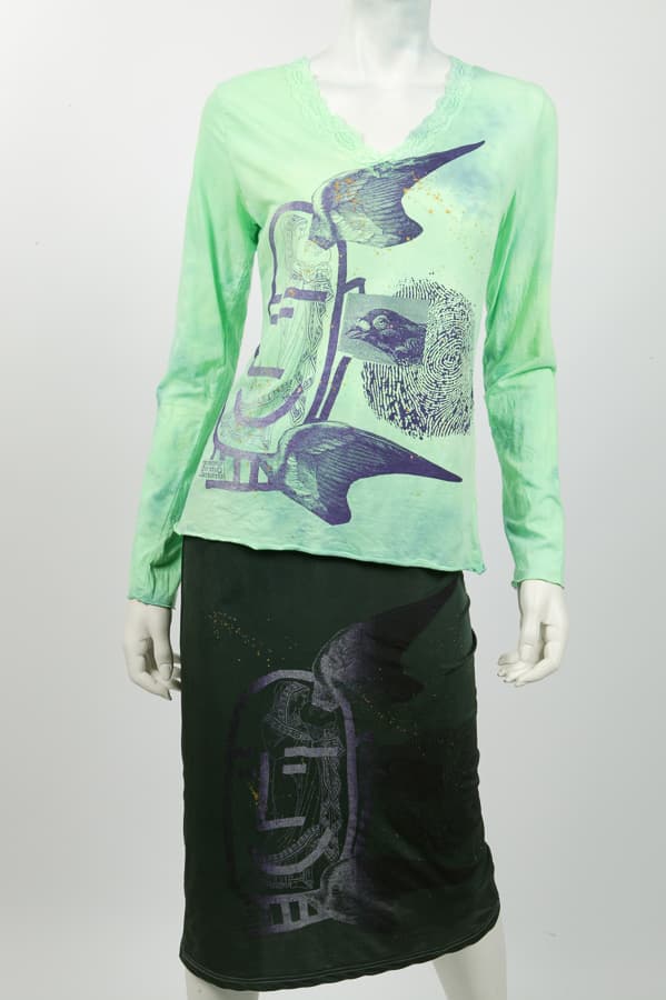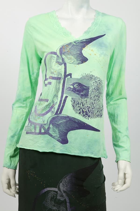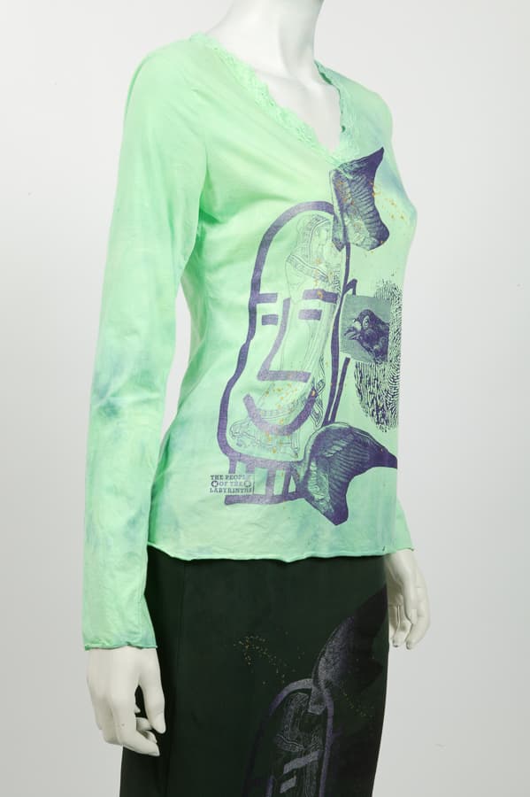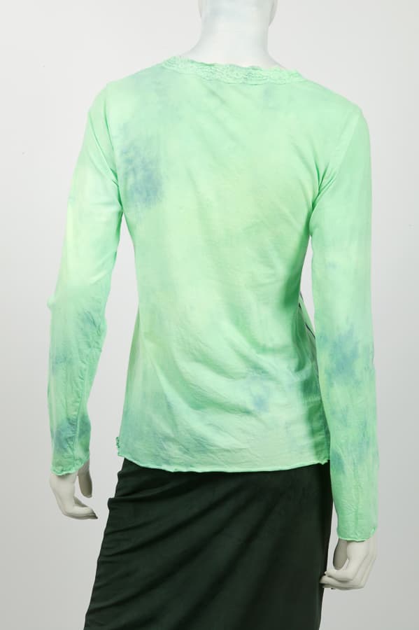 Cotton lycra long sleeve with lace trimming around the neckline. Composition: 89% cotton, 11% lycra.
