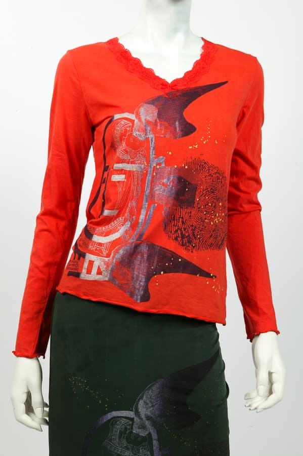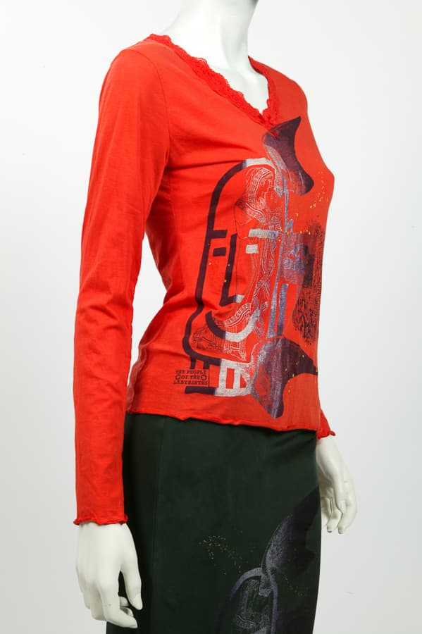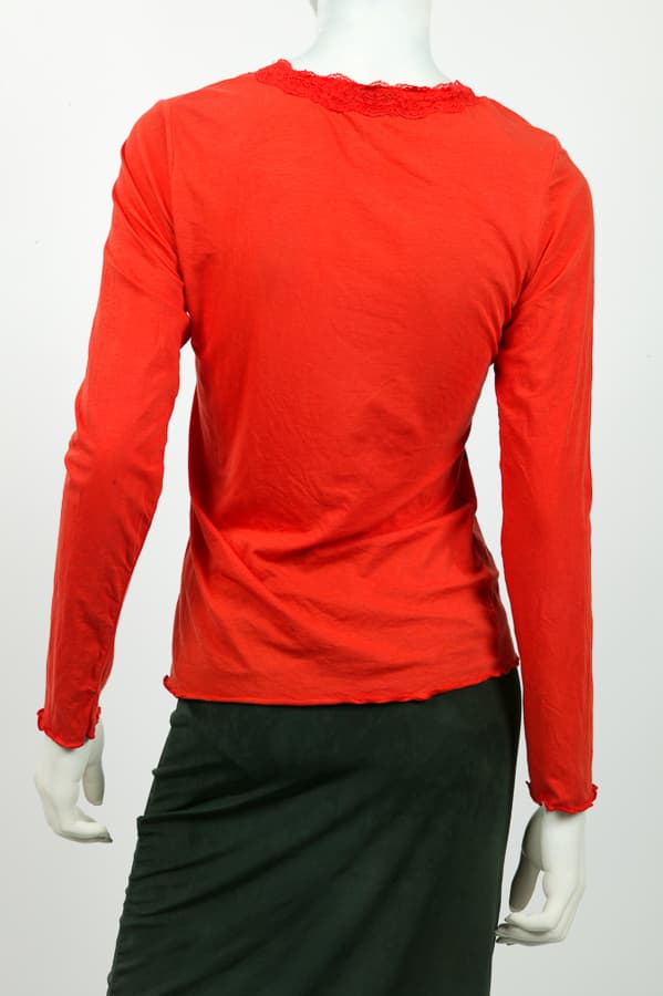 Cotton lycra long sleeve with lace trimming around the neckline. Composition: 89% cotton, 11% lycra.