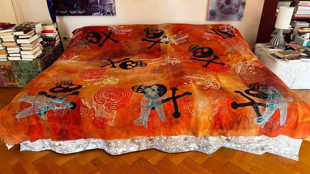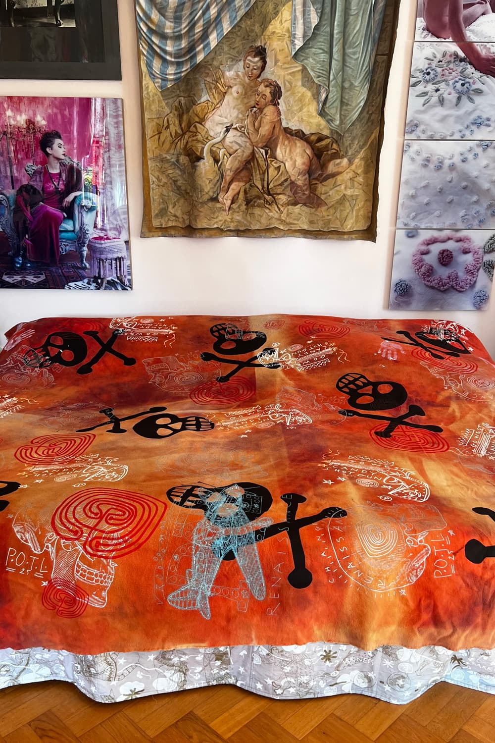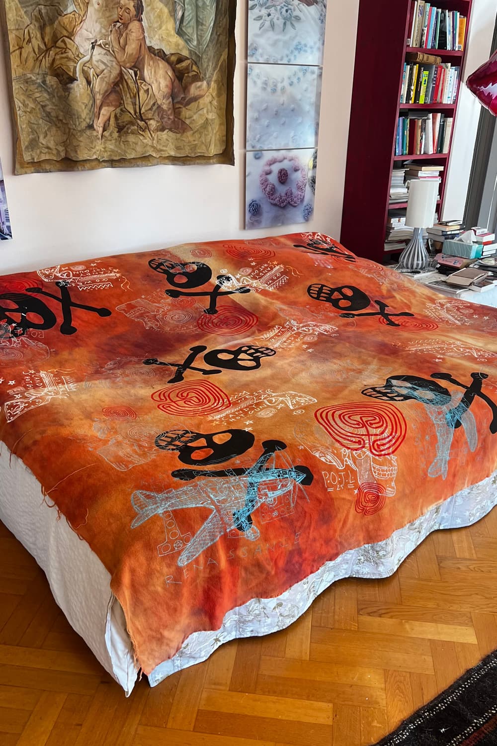 Hand dyed and printed on rough cotton molton. Throw it on your bed, sofa or hang it on the wall as an artwork. Made to order, please allow for a delivery time of 6 weeks. Every piece is unique.