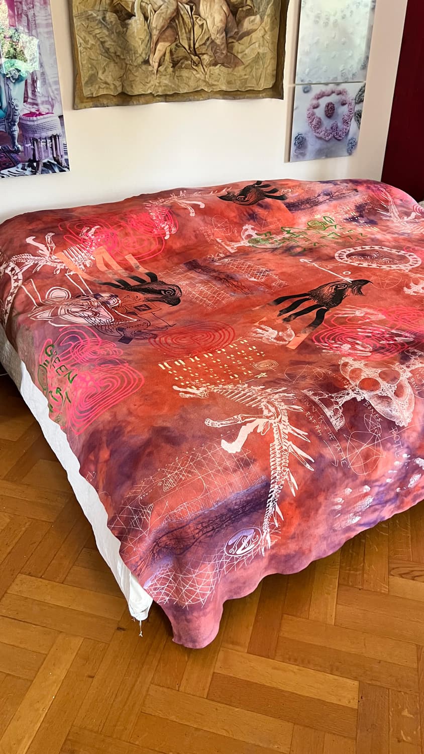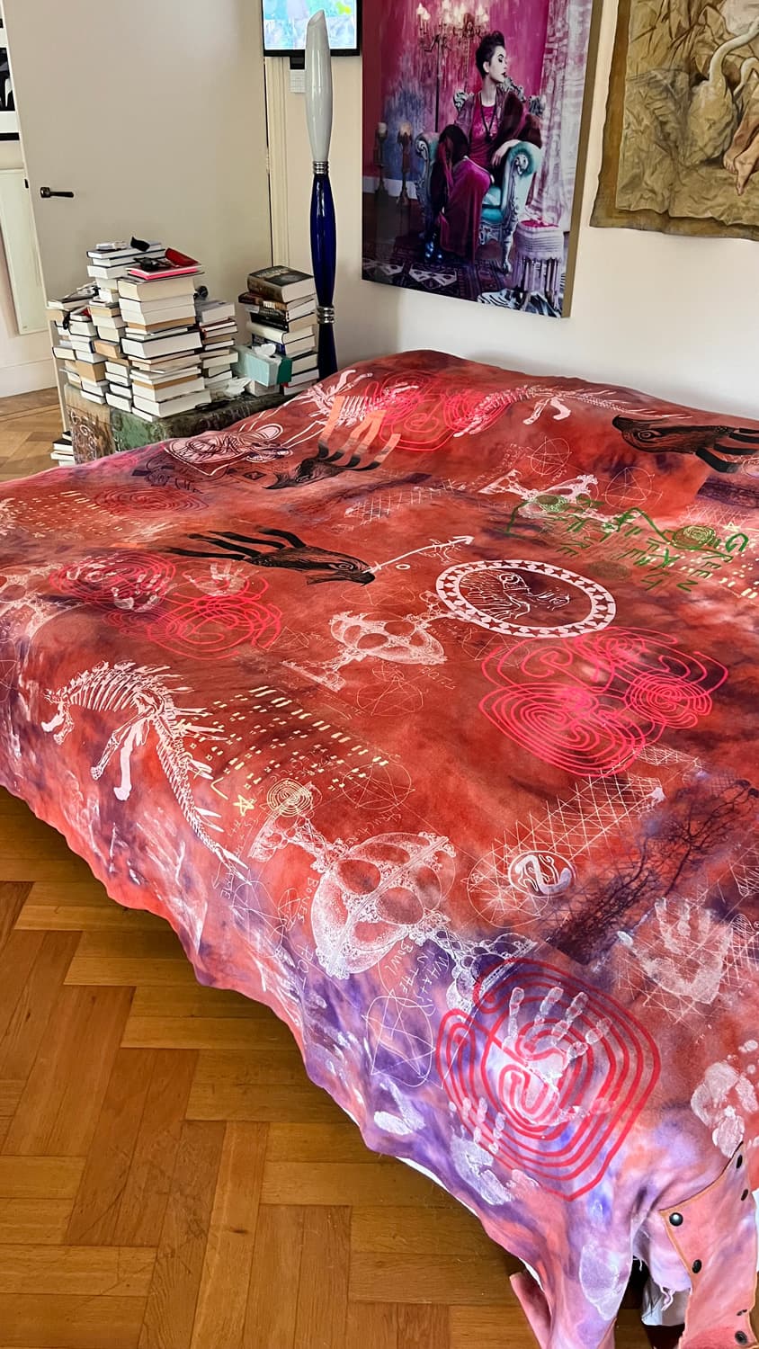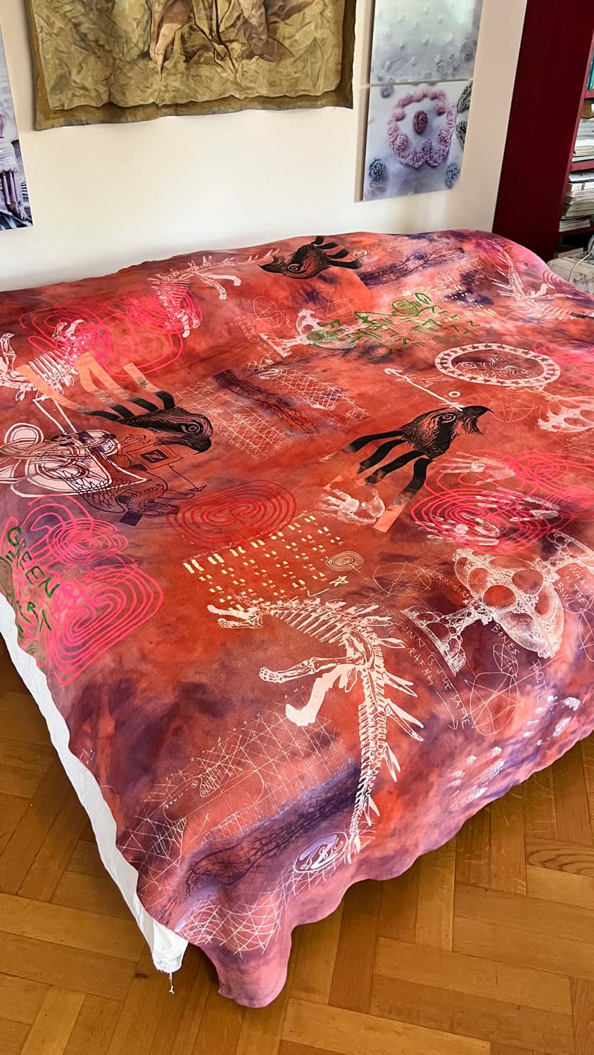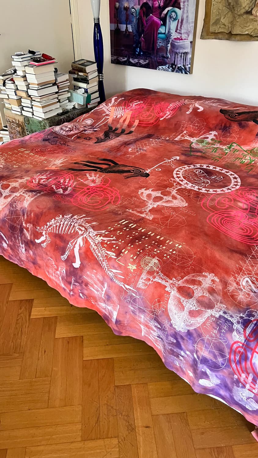 Hand dyed and screen printed on rough cotton molton. Use it as a bedcover, furniture wrap or hang it on the wall as an art piece.