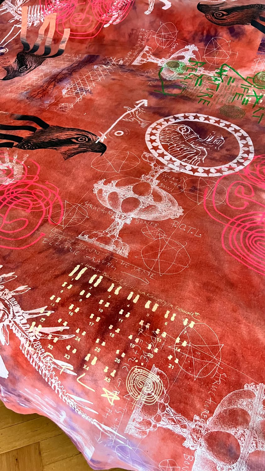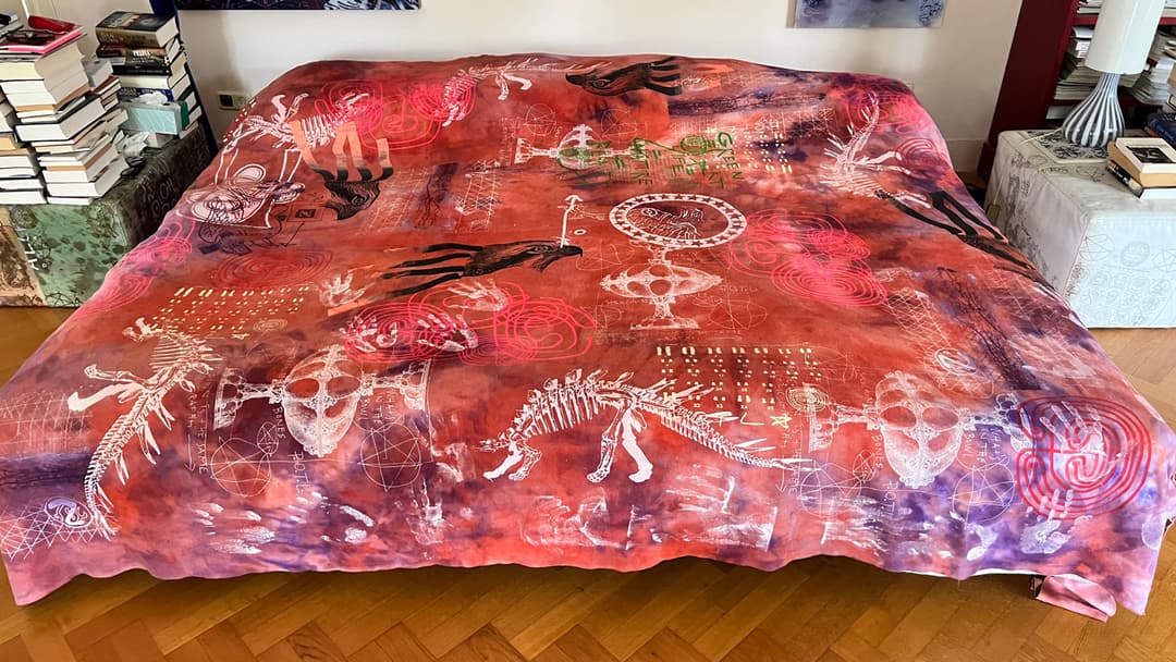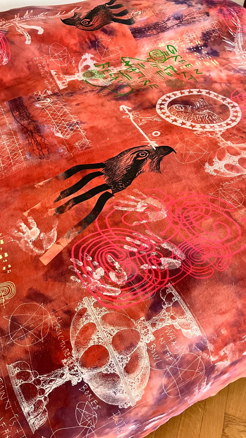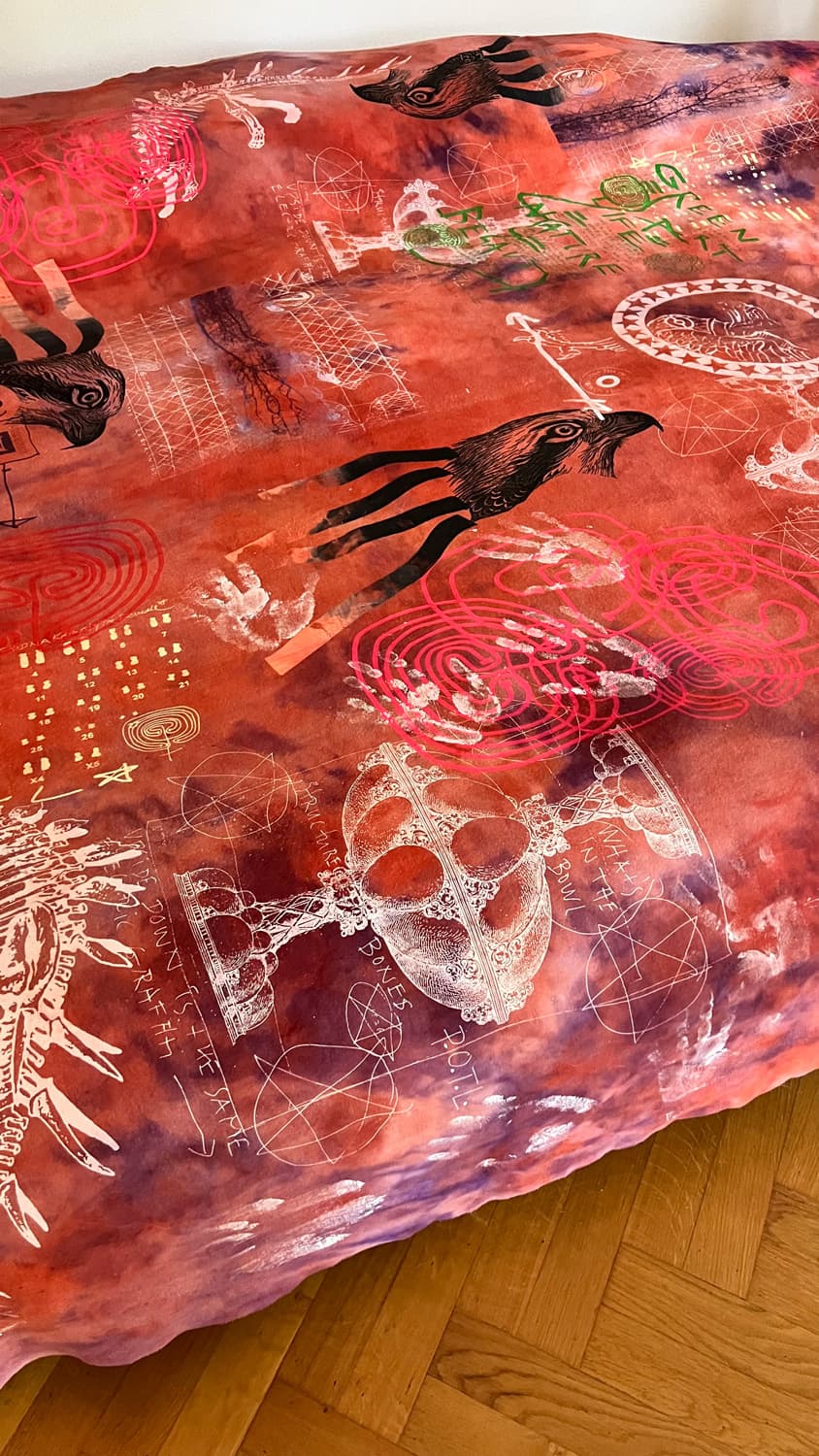 Hand dyed and screen printed on rough cotton molton. Use it as a bedcover, furniture wrap or hang it on the wall as an art piece.