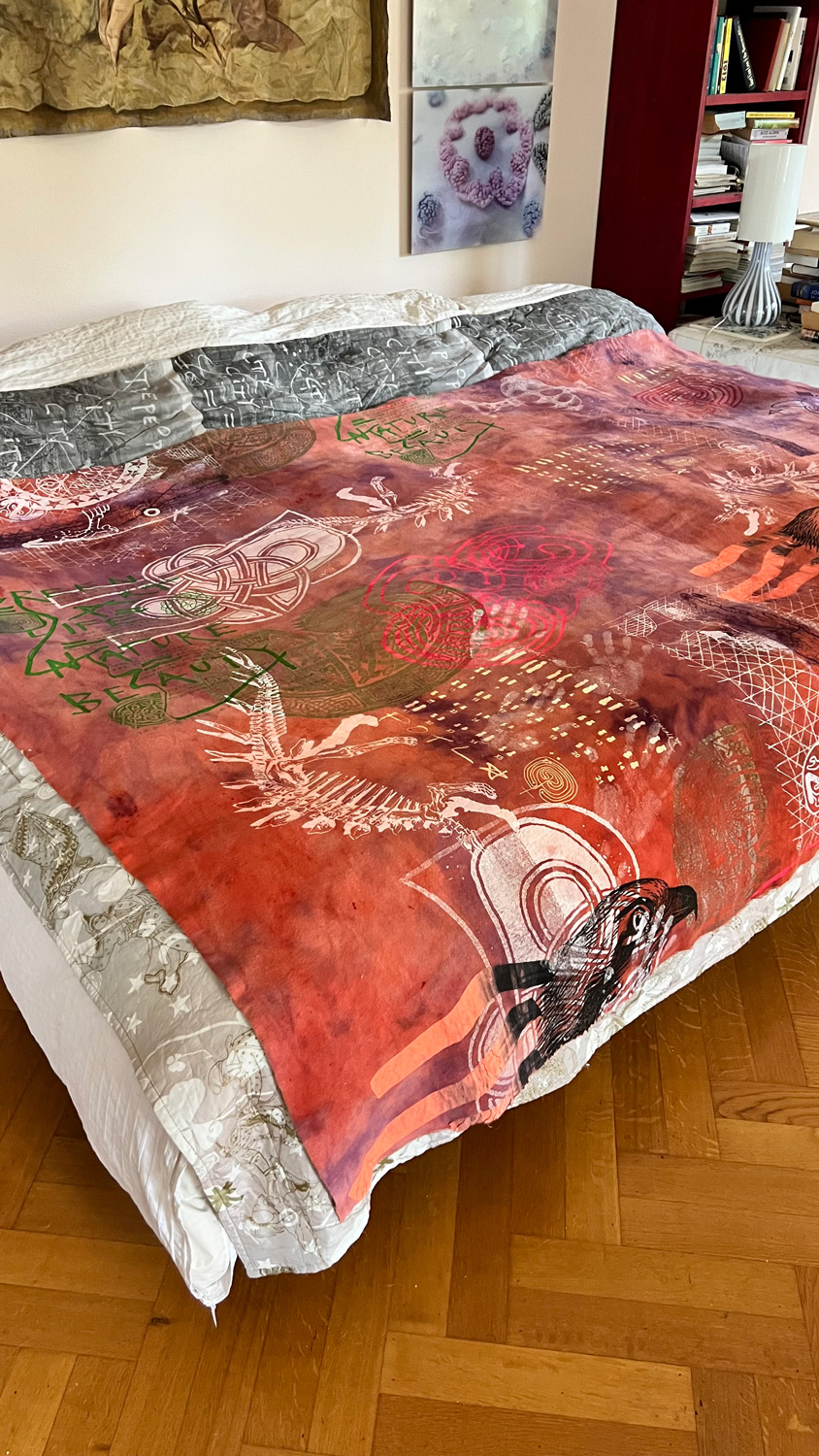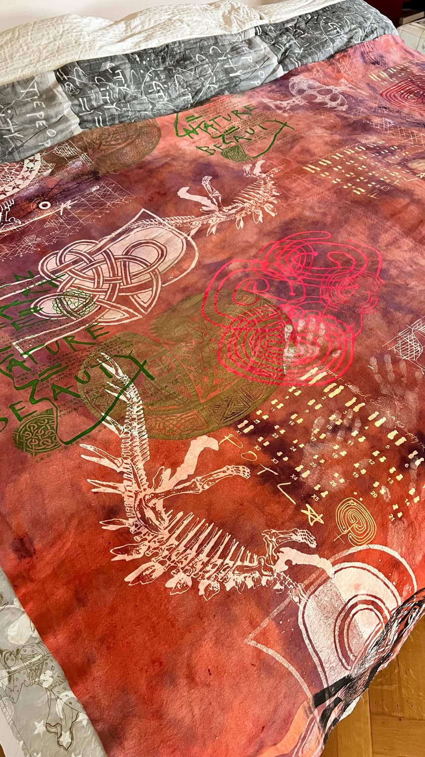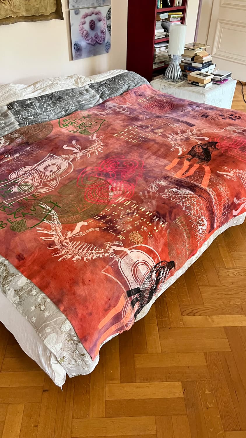 Hand dyed and screen printed on rough cotton molton. Use it as a bedcover, furniture wrap or hang it on the wall as an art piece.