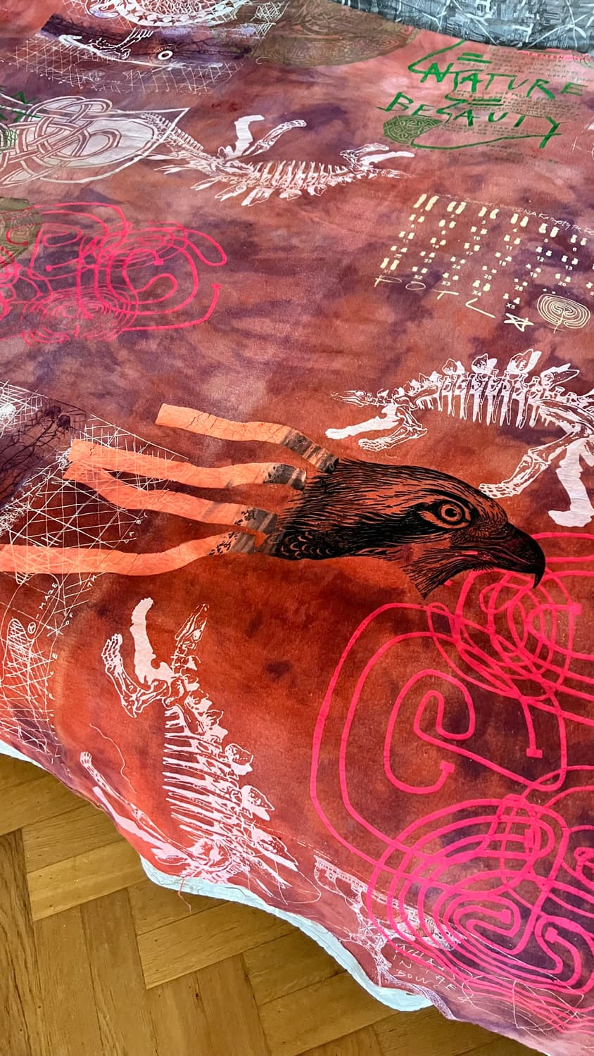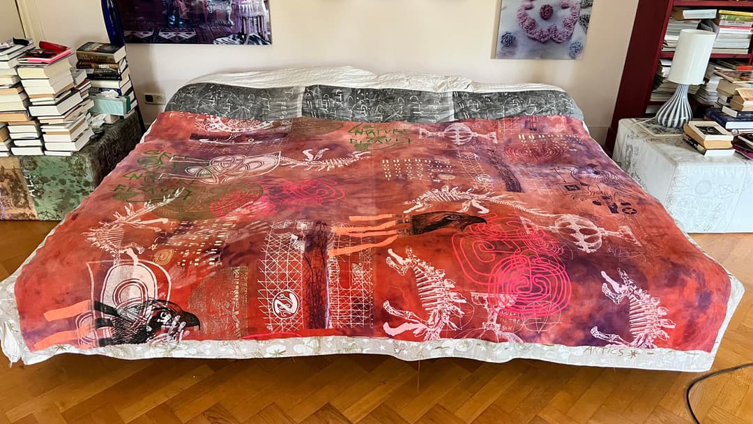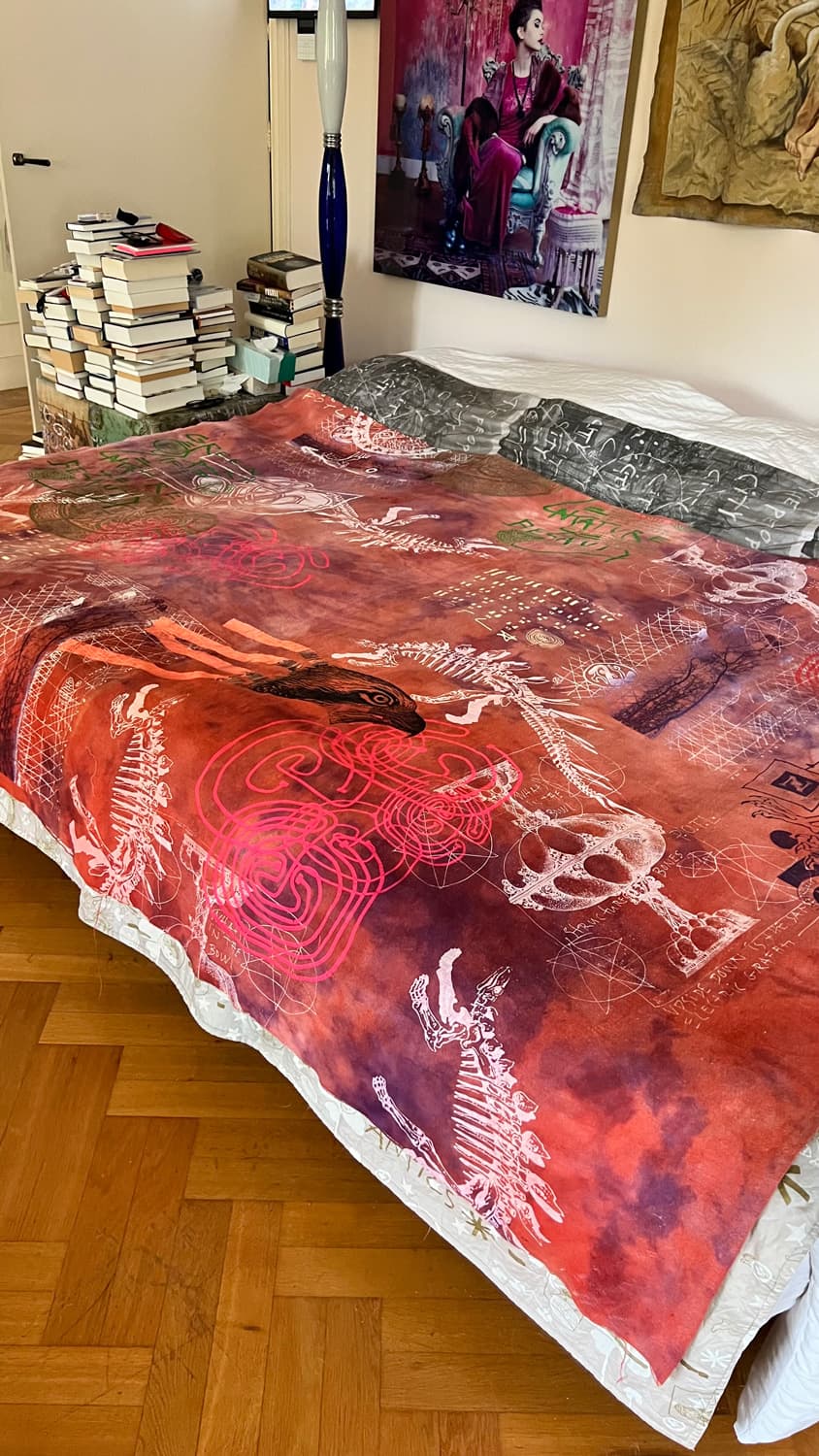Hand dyed and screen printed on rough cotton molton. Use it as a bedcover, furniture wrap or hang it on the wall as an art piece.