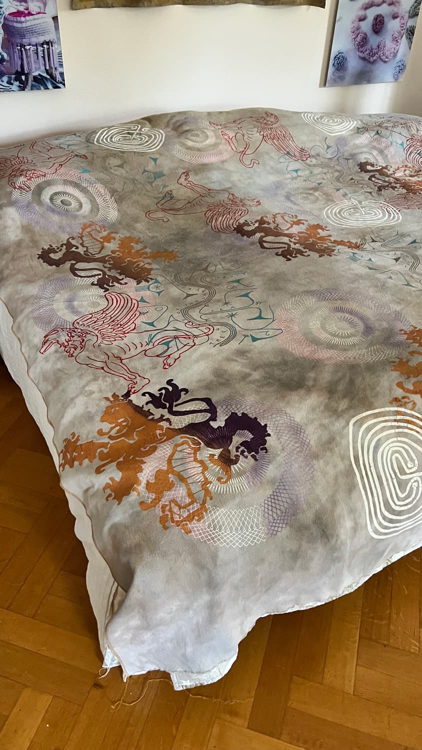 Hand dyed and screen printed on rough cotton molton. Use it as a bedcover, furniture wrap or hang it on the wall as an art piece.