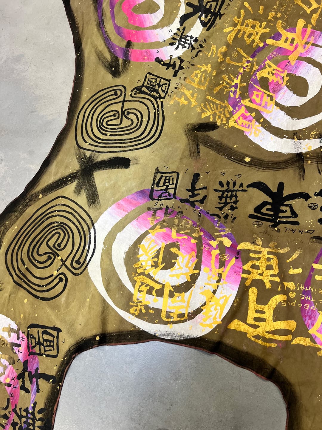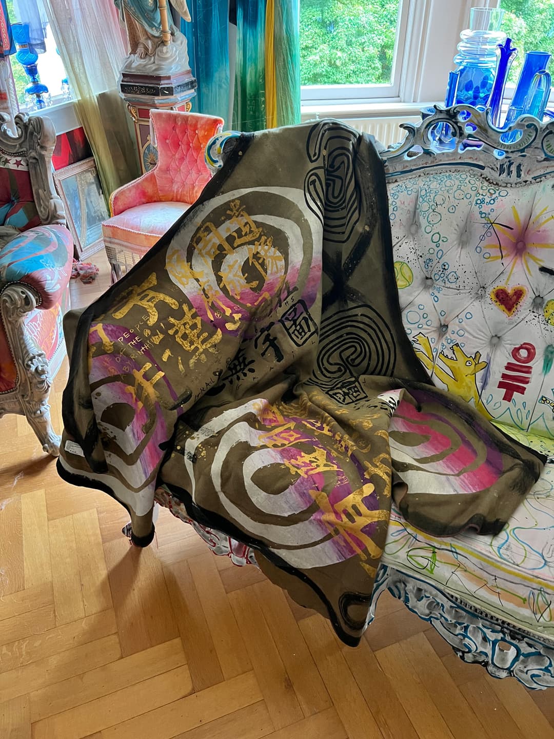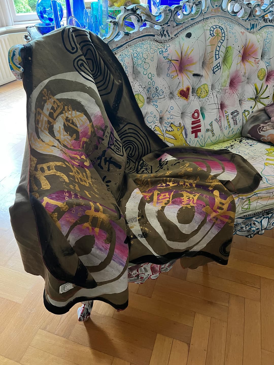 Hand dyed and screen printed on rough cotton molton. Use it as a bedcover, furniture wrap or hang it on the wall as an art piece.