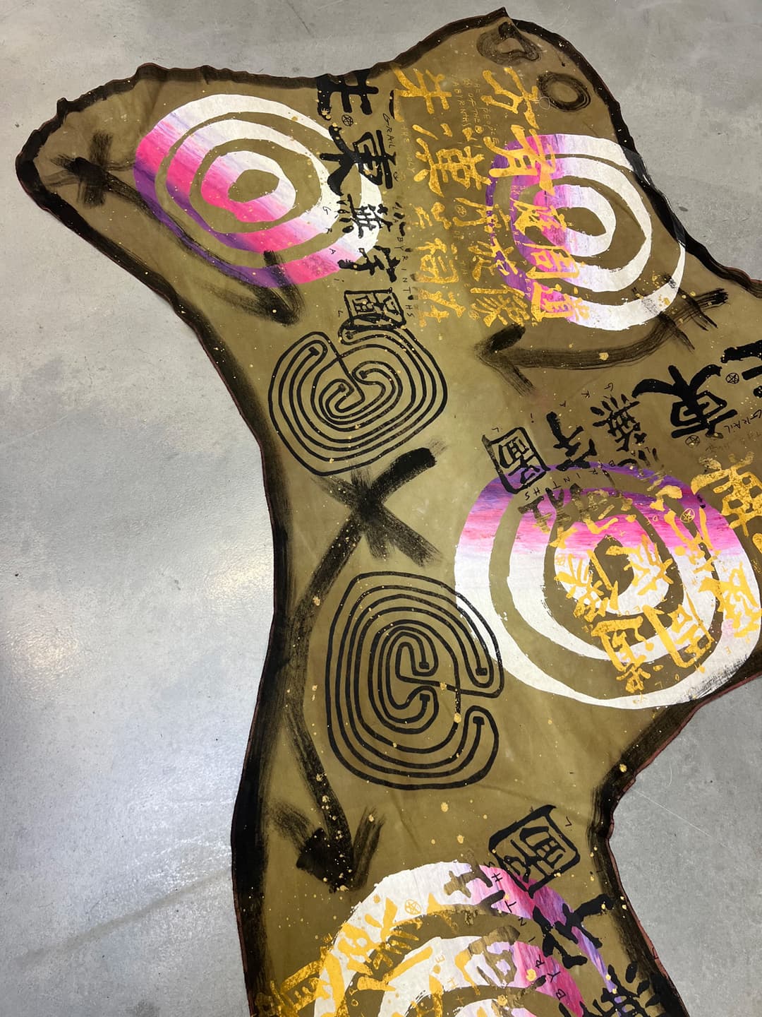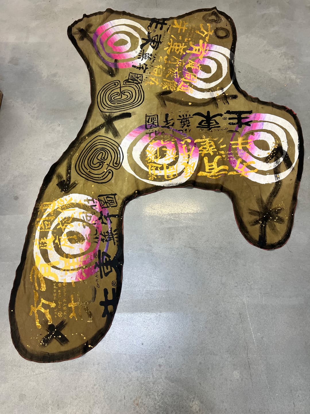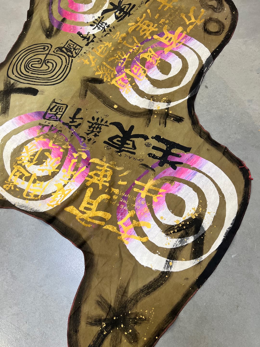 Hand dyed and screen printed on rough cotton molton. Use it as a bedcover, furniture wrap or hang it on the wall as an art piece.
