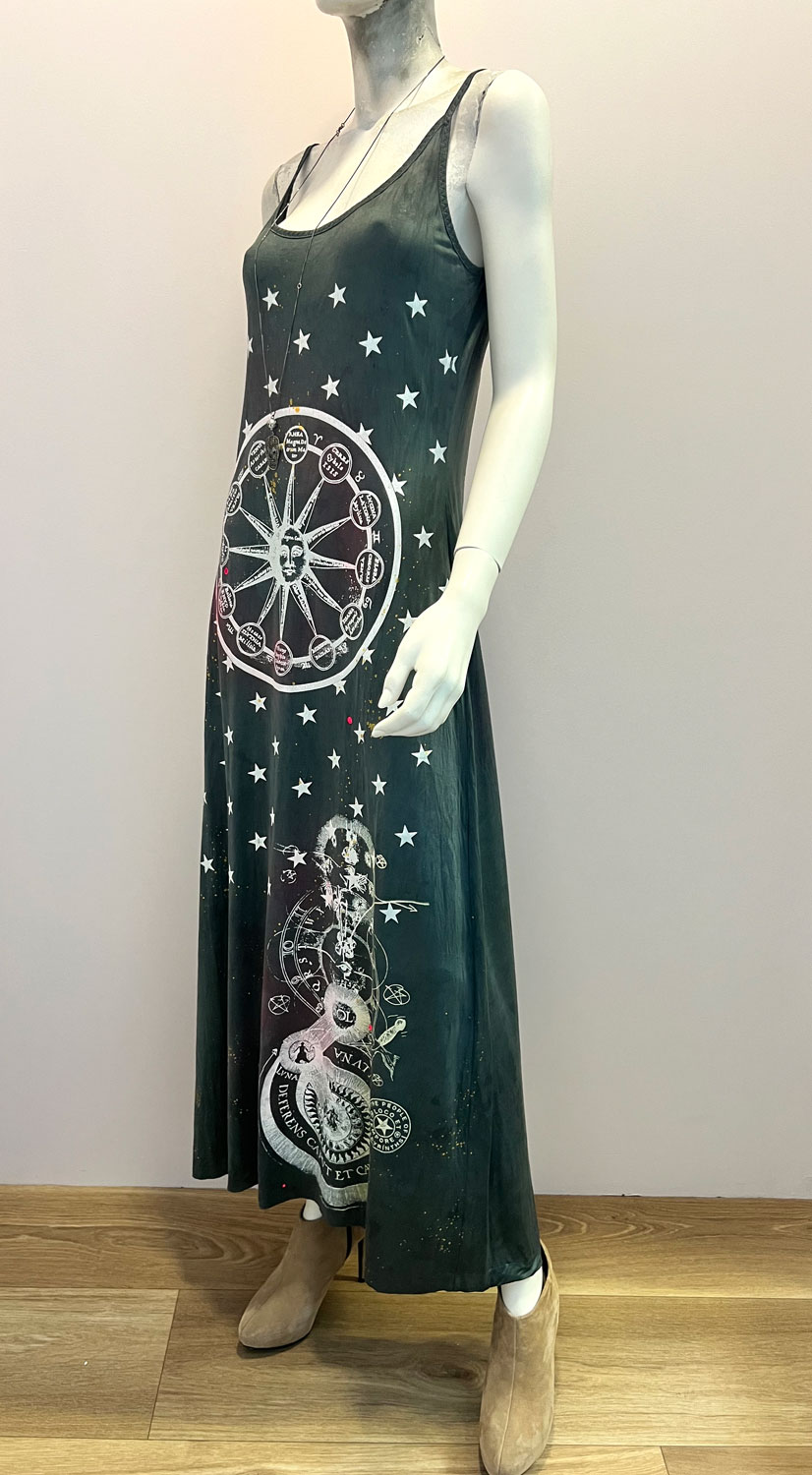 Hand dyed and screen printed silk jersey singlet dress, A-line. 100% silk.