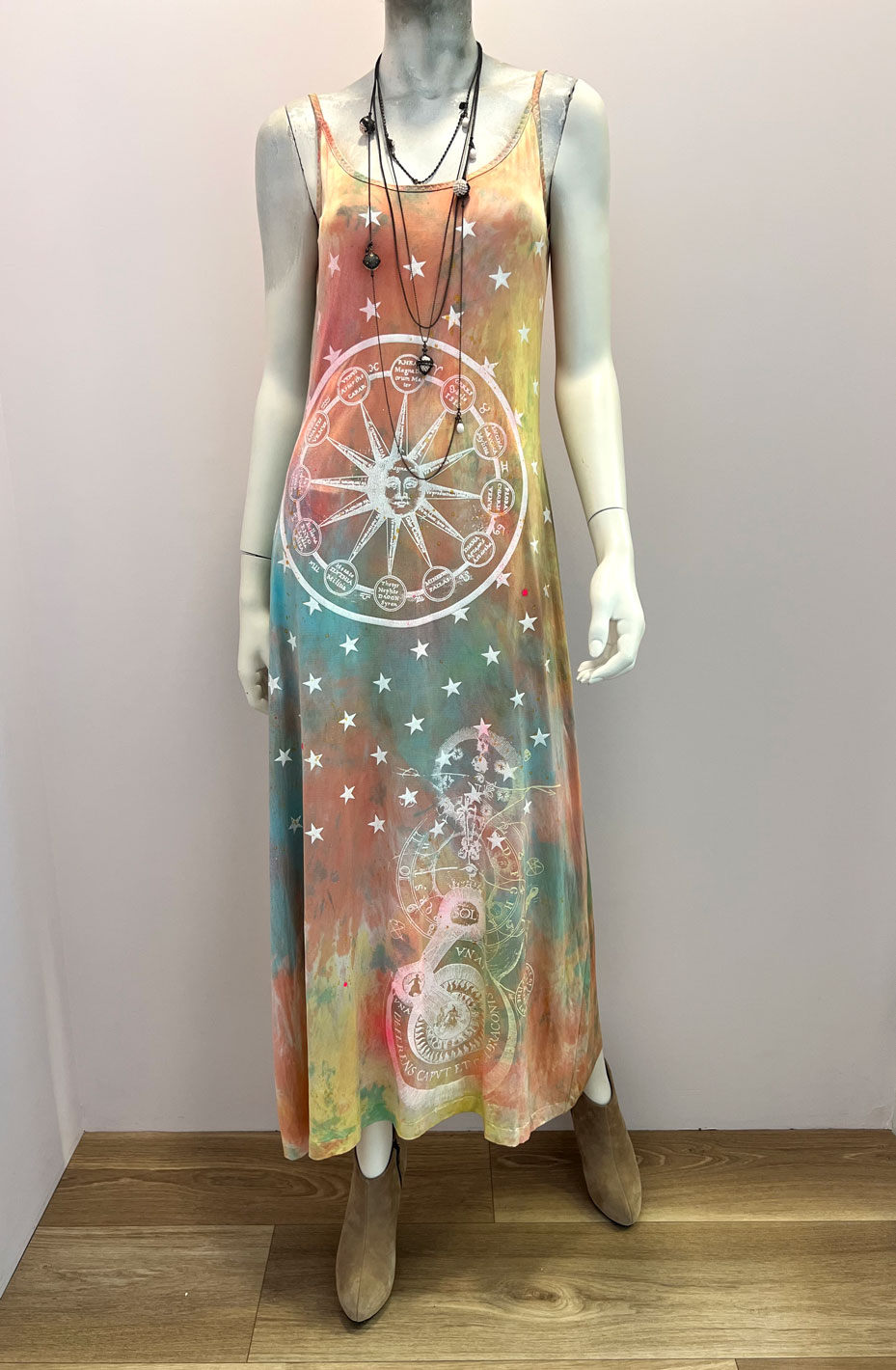 Hand dyed and screen printed silk jersey singlet dress, A-line. 100% silk.