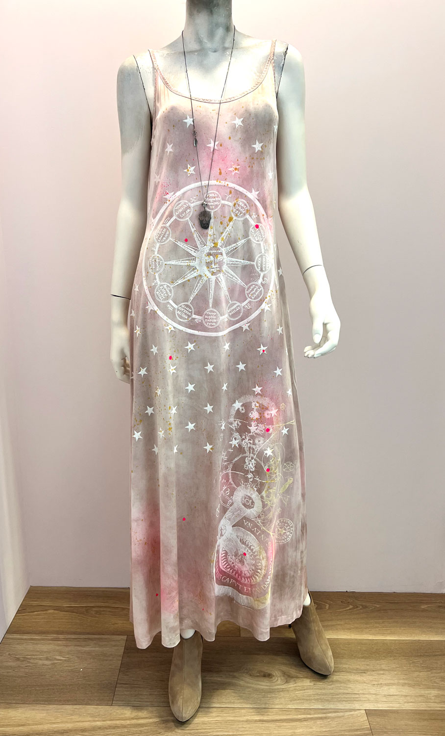 Hand dyed and screen printed silk jersey singlet dress, A-line. 100% silk.