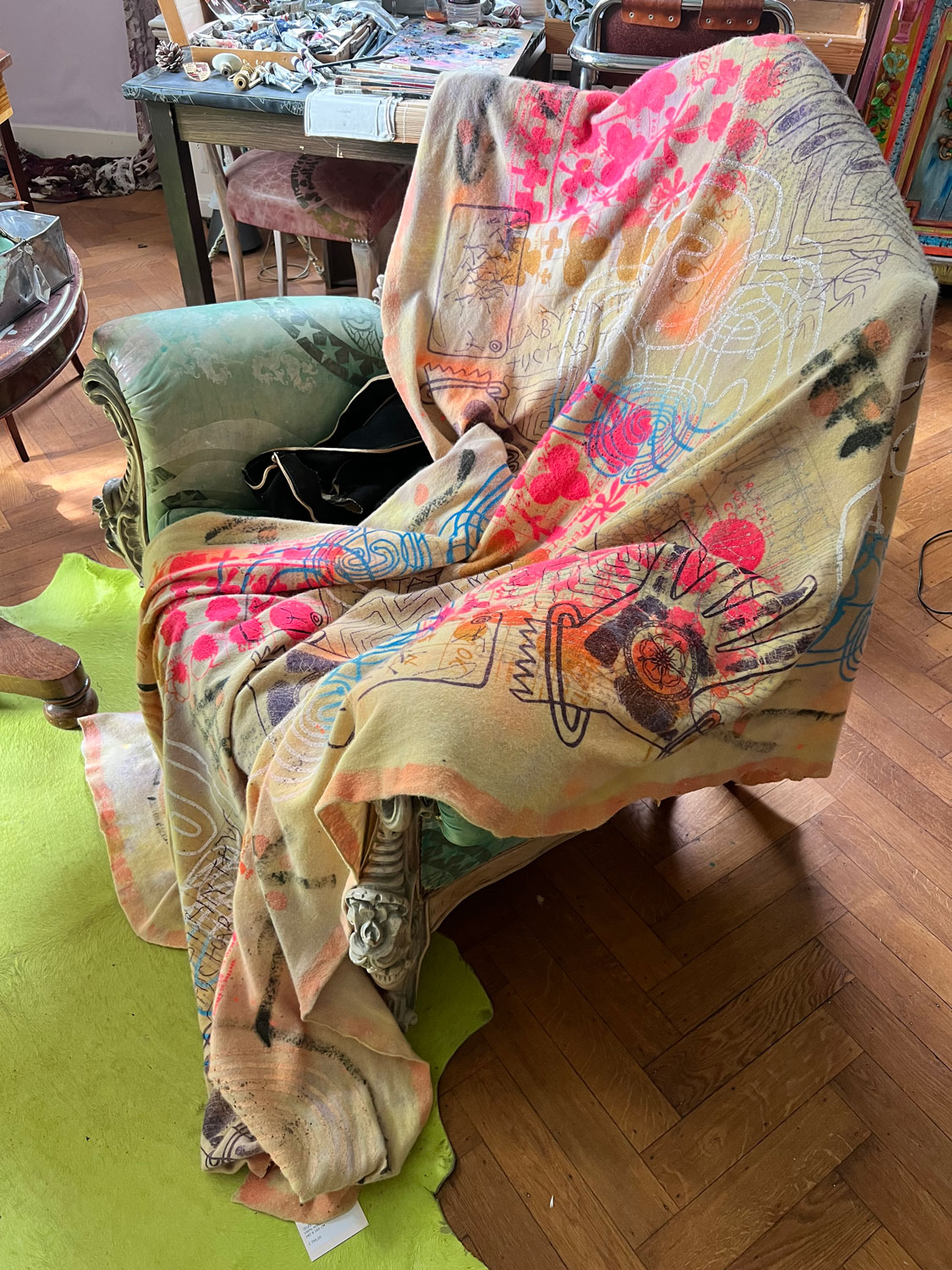 Hand dyed and screen printed wool shawl. 240 x 165 cm. 100% wool.
