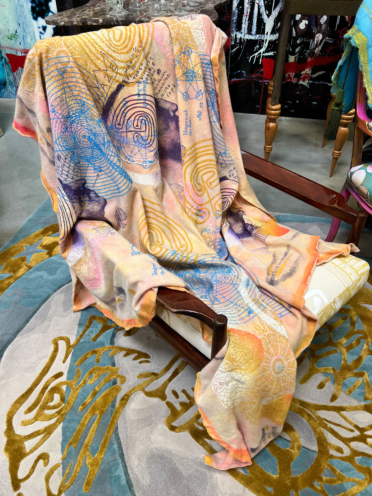 Hand dyed and screen printed wool shawl. 165 x 165 cm. 100% wool.