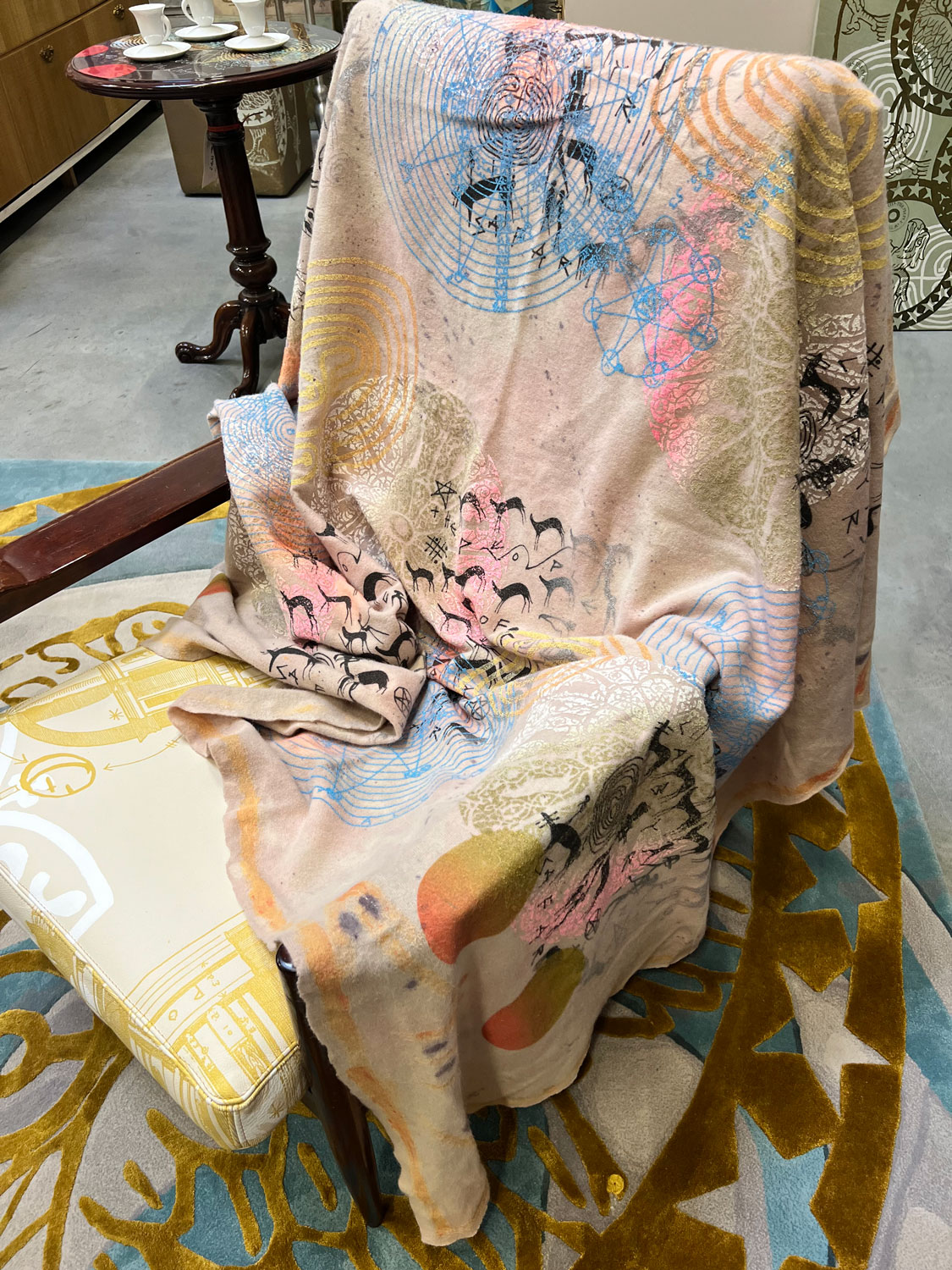 Hand dyed and screen printed wool shawl. 160 x 180 cm. 100% wool.