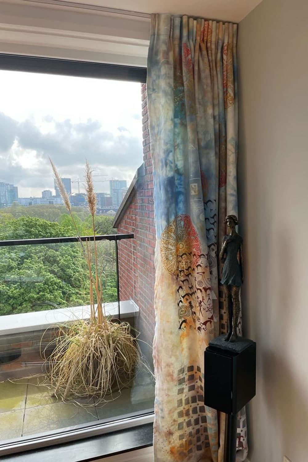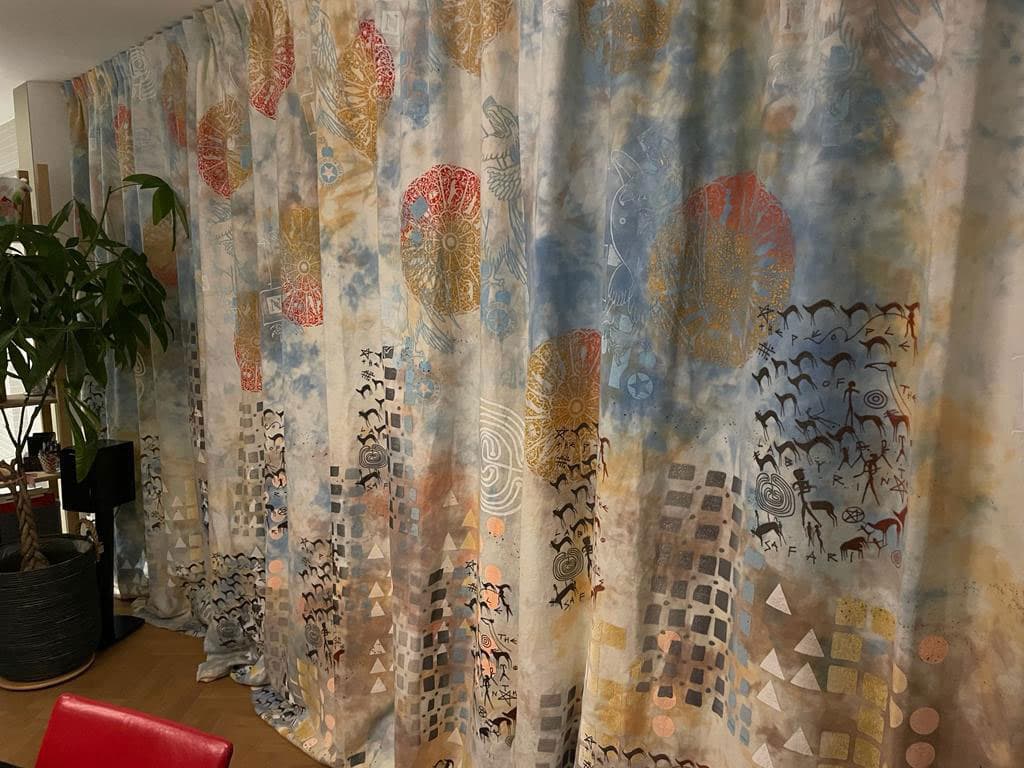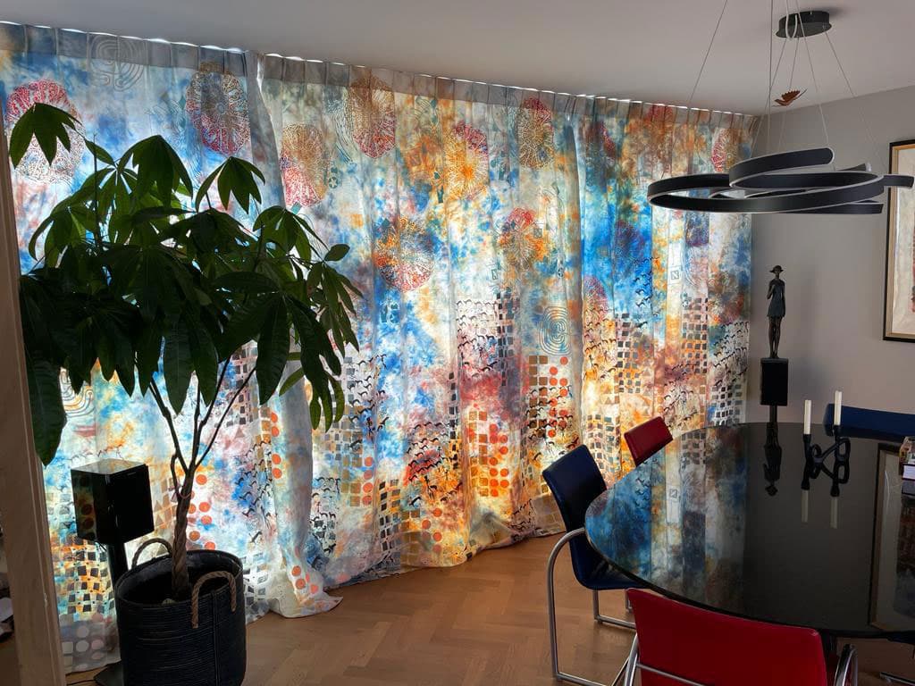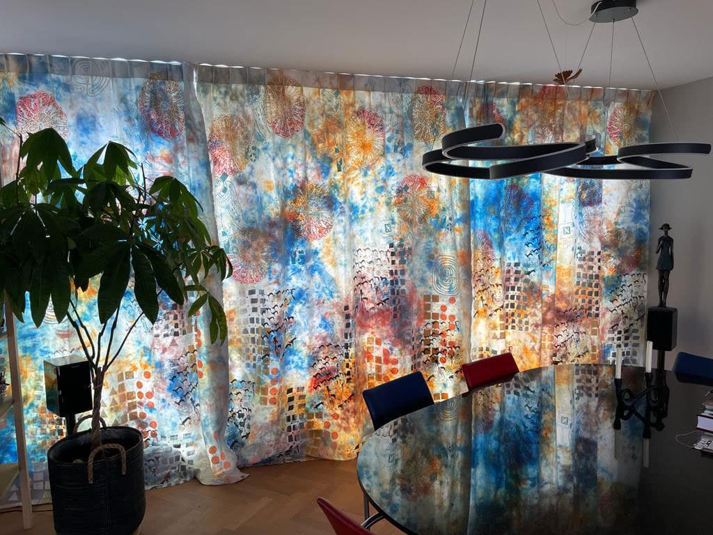 Dress up your rooms. At POTL we design made-to-measure curtains. They are hand dyed and screen printed in our atelier on linen, silk and cotton molton material. Or digitally printed on recycled polyester.