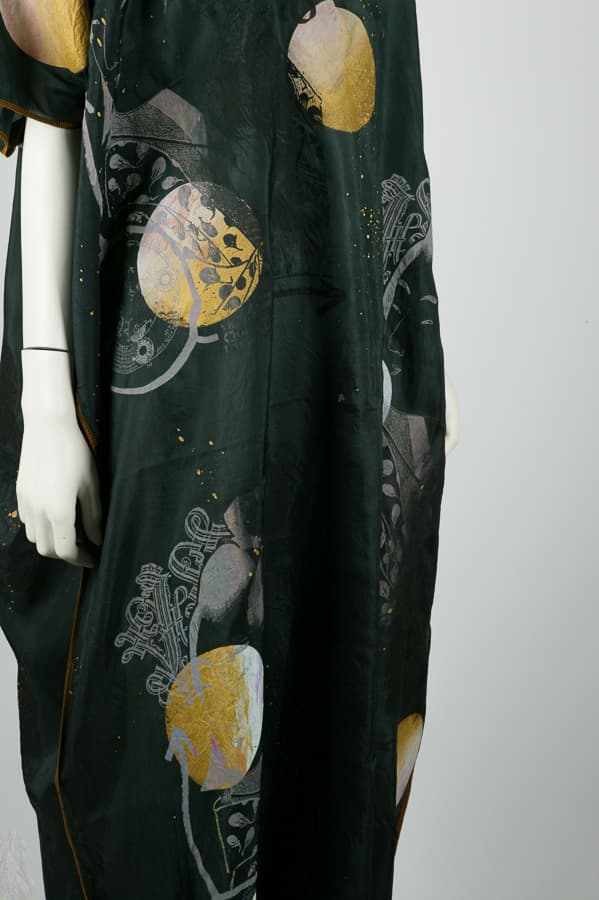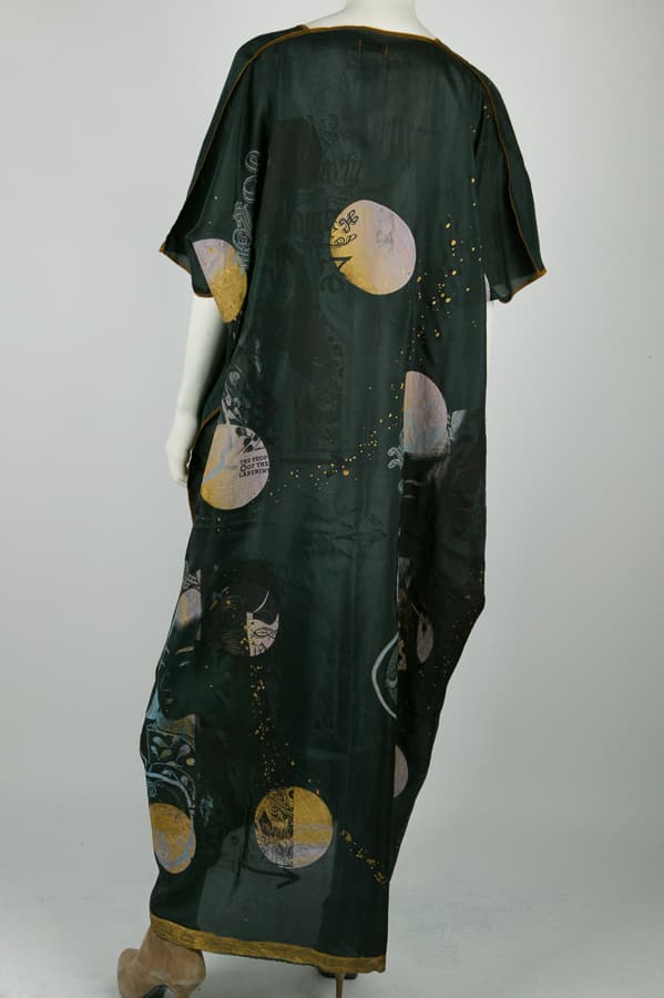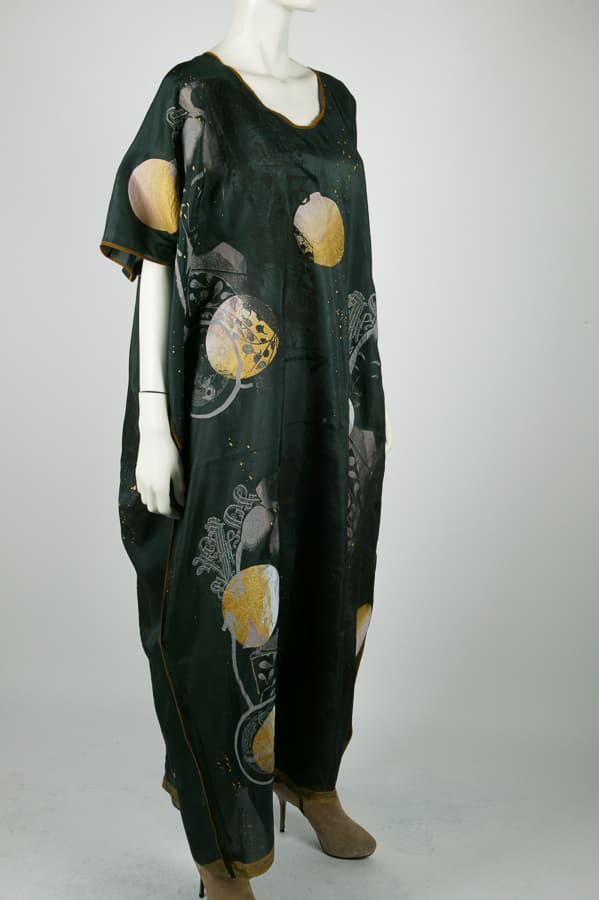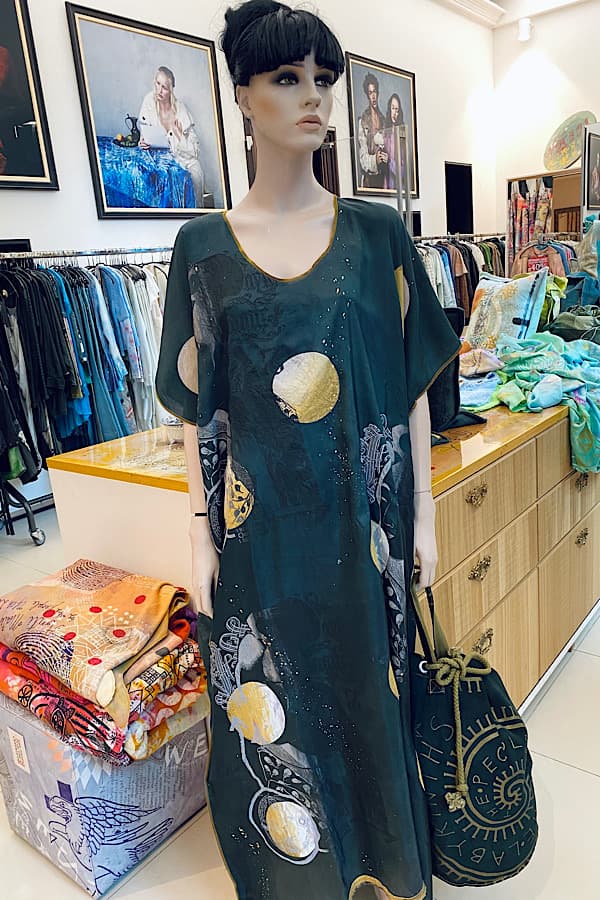 Unique Handprinted, handdyed and handpainted luxurious silk caftan. Limited Edition. One size fits all. Couture for summer holidays, pool parties and summer beach days."Casual for Presidents".