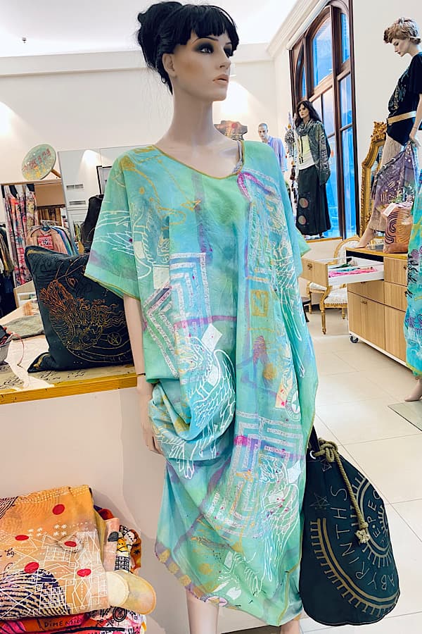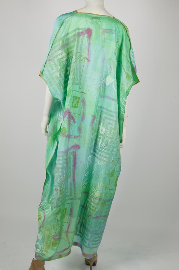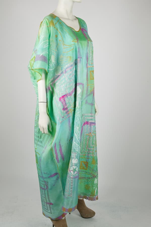 Unique Handprinted, handdyed and handpainted luxurious silk caftan. Limited Edition. One size fits all. Couture for summer holidays, pool parties and summer beach days."Casual for Presidents".