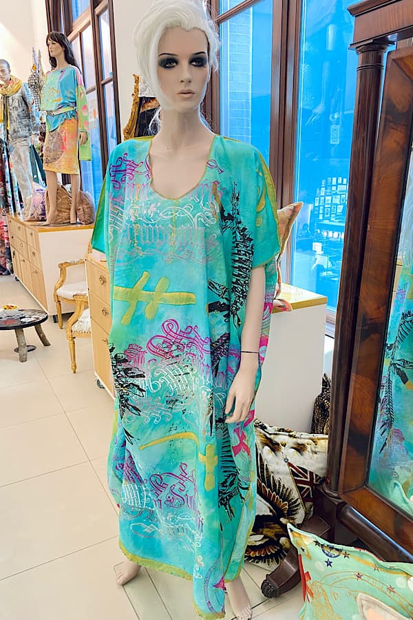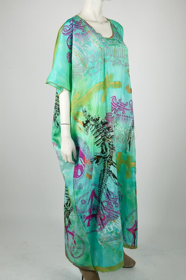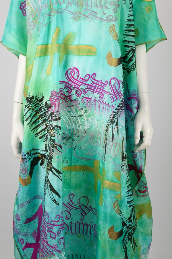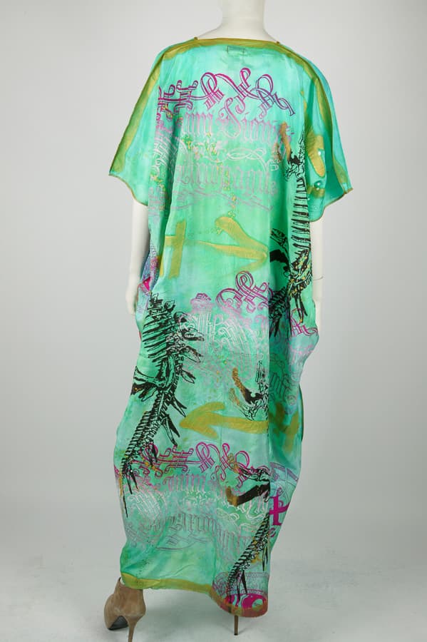 Unique Handprinted, handdyed and handpainted luxurious silk caftan. Limited Edition. One size fits all. Couture for summer holidays, pool parties and summer beach days."Casual for Presidents".