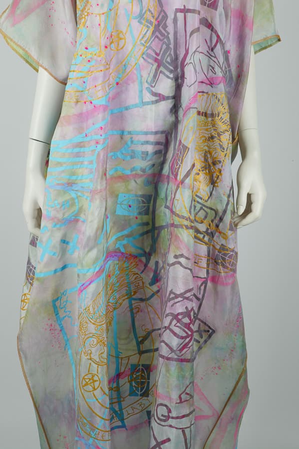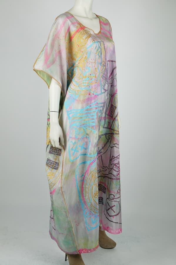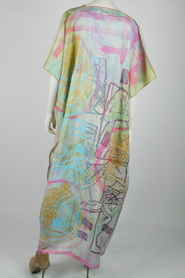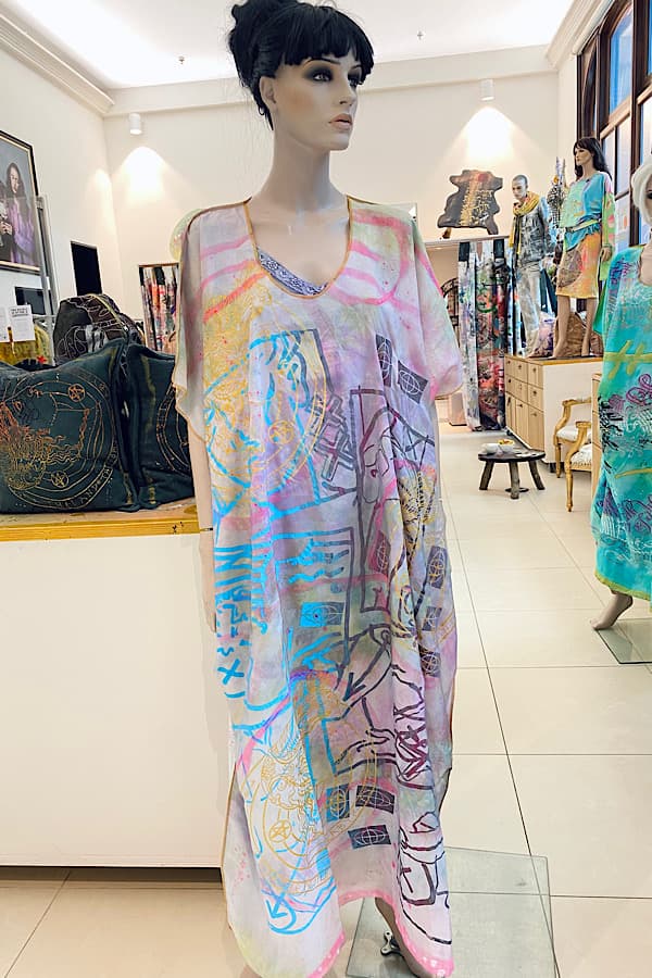 Unique Handprinted, handdyed and handpainted luxurious silk caftan. Limited Edition. One size fits all. Couture for summer holidays, pool parties and summer beach days."Casual for Presidents".