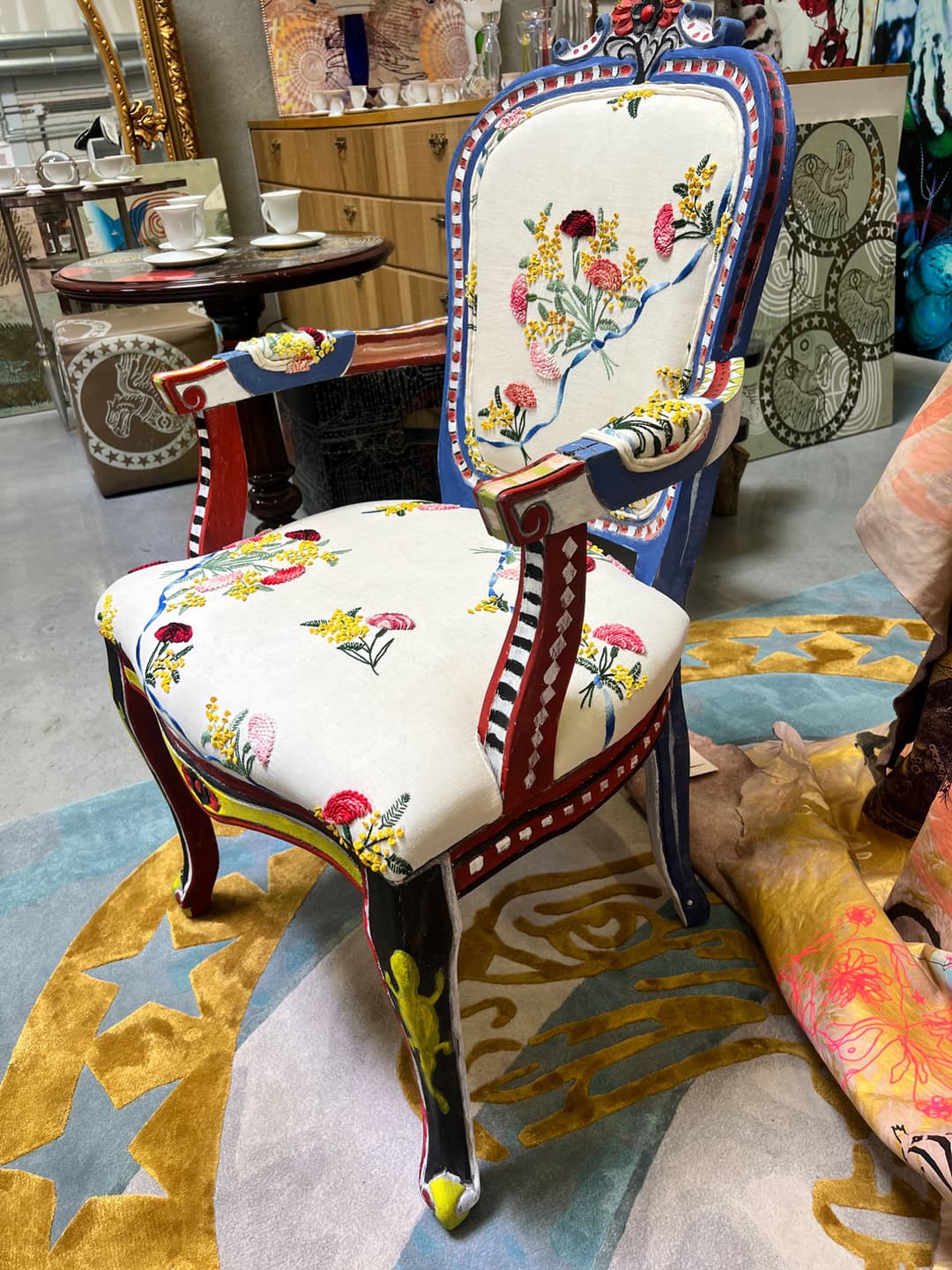 This hand painted vintage dining chair is upholstered with delicately embroidered flowers. Unique piece.