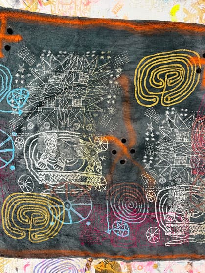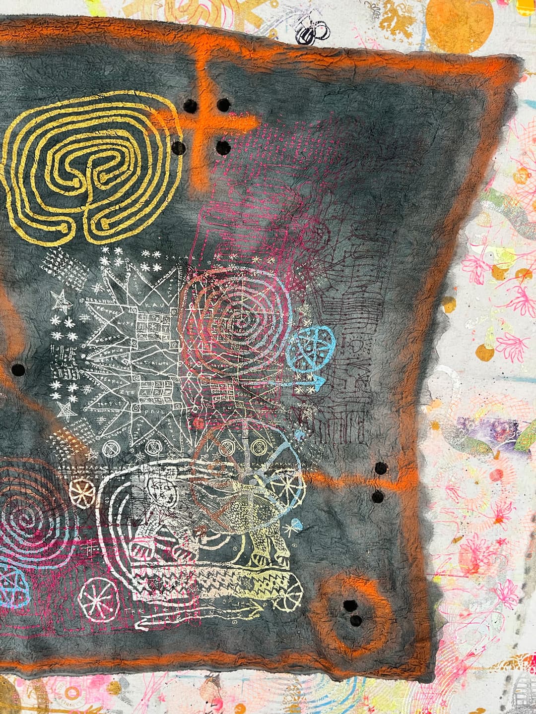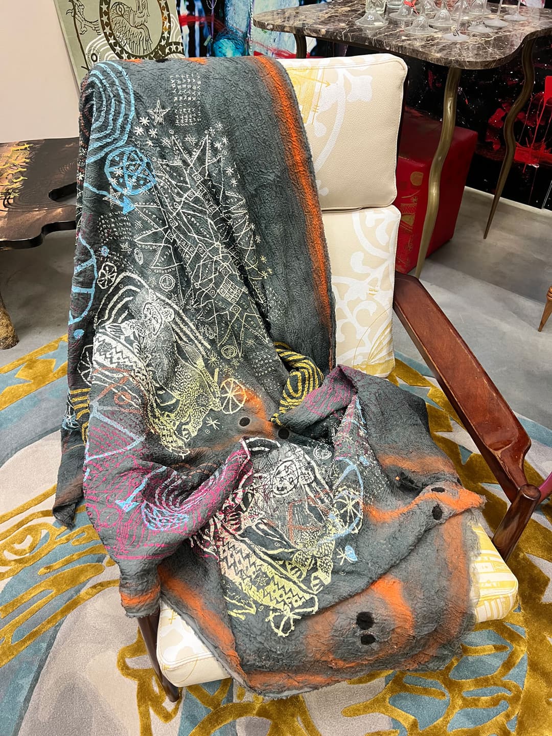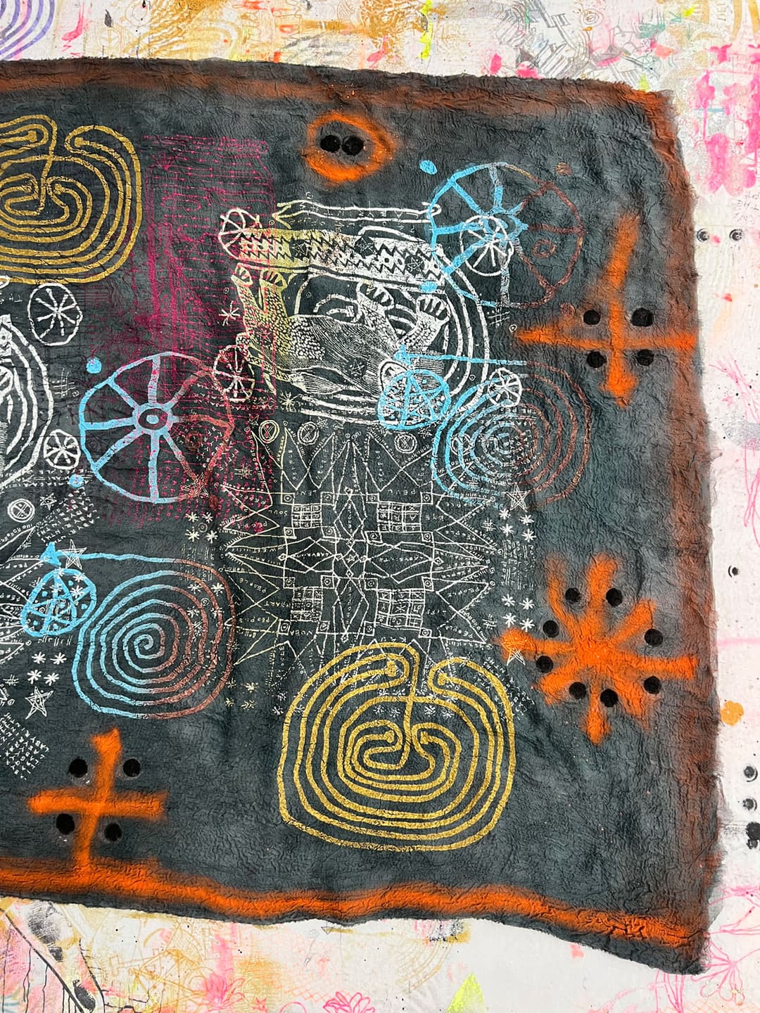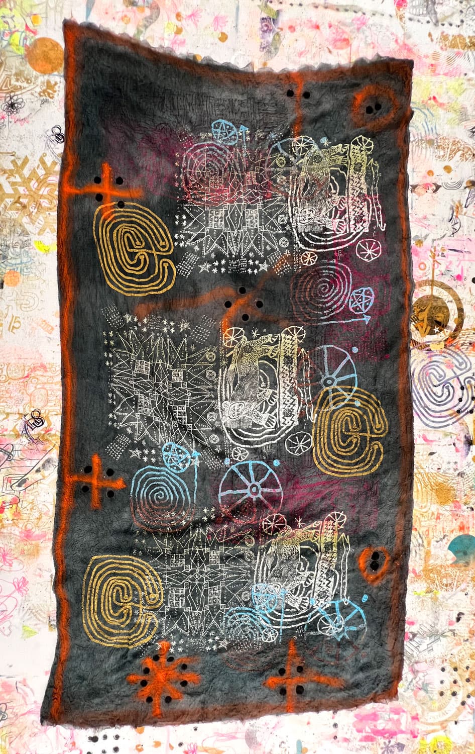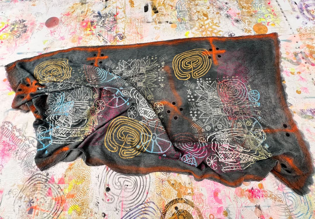 Hand dyed and screen printed silk shawl made of triple cloth. 100% silk. Size 115 x 220 cm.