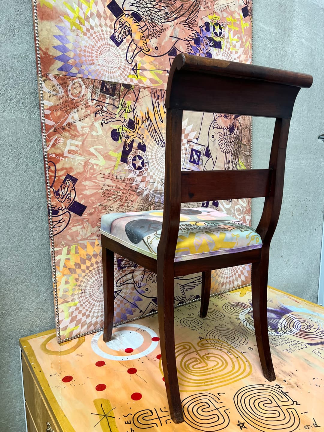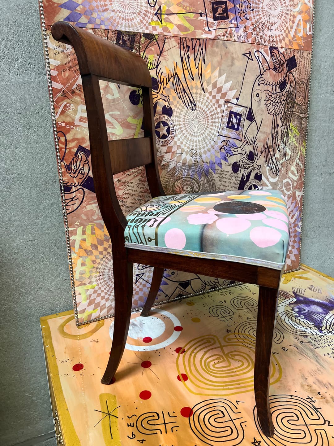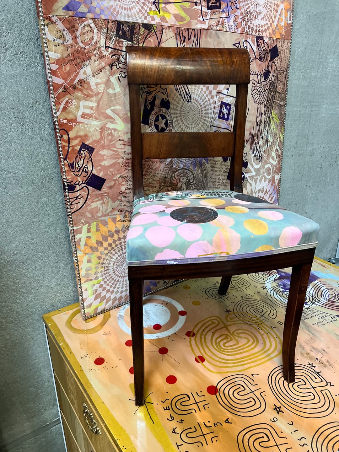 Newly upholstered biedermeier antique chair with hand dyed, painted and screenprinted leather. Unique piece.