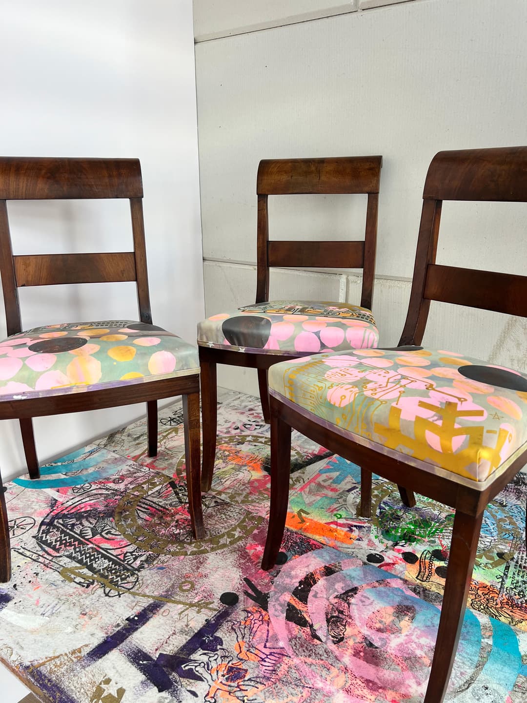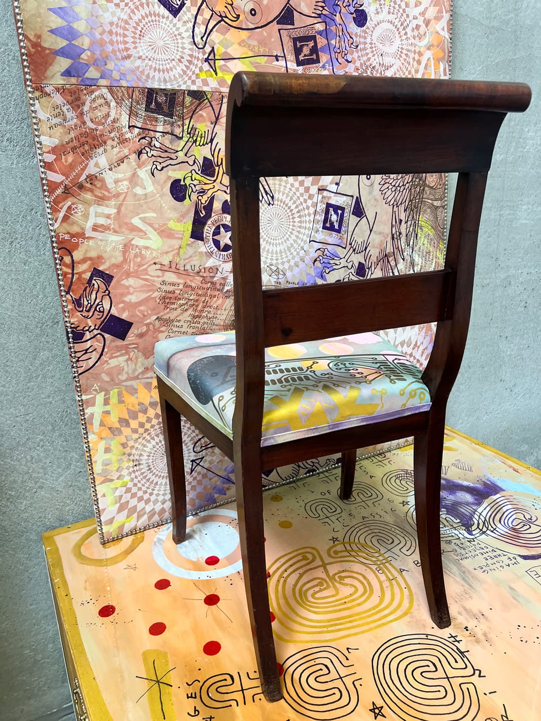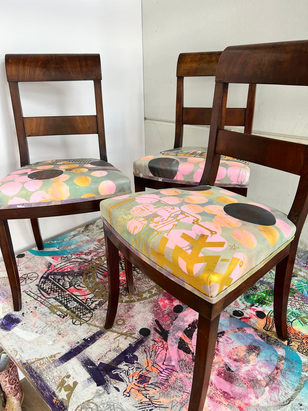 Newly upholstered biedermeier antique chair with hand dyed, painted and screenprinted leather. Unique piece.