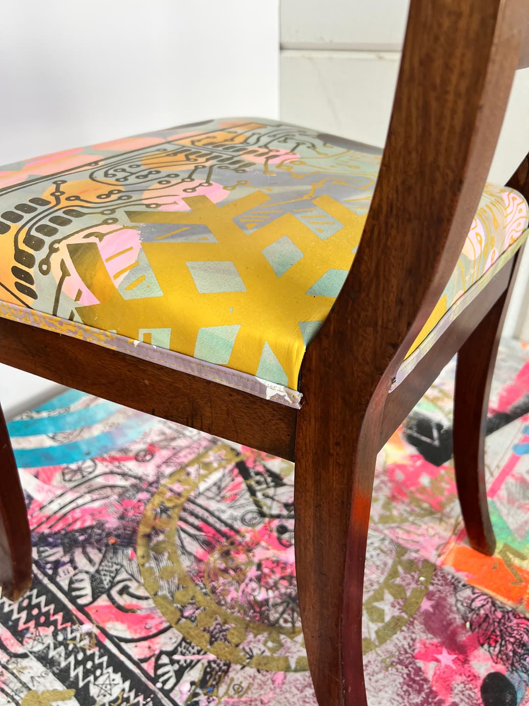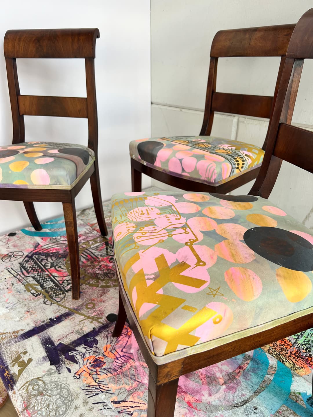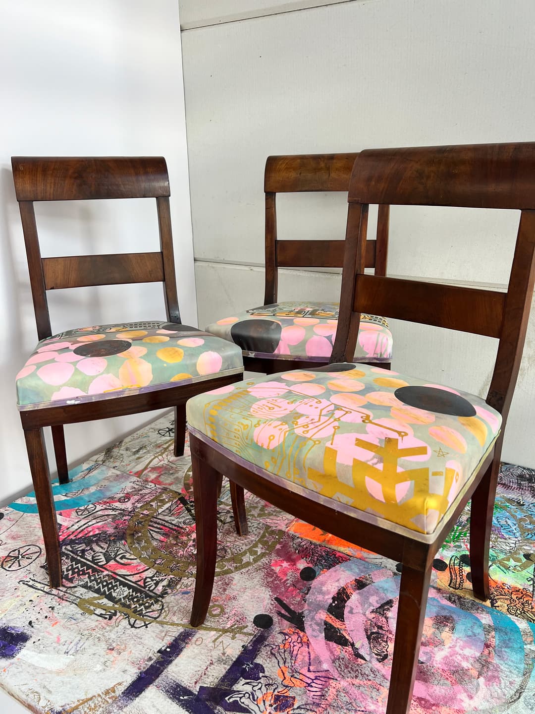 Newly upholstered biedermeier antique chair with hand dyed, painted and screenprinted leather. Unique piece.