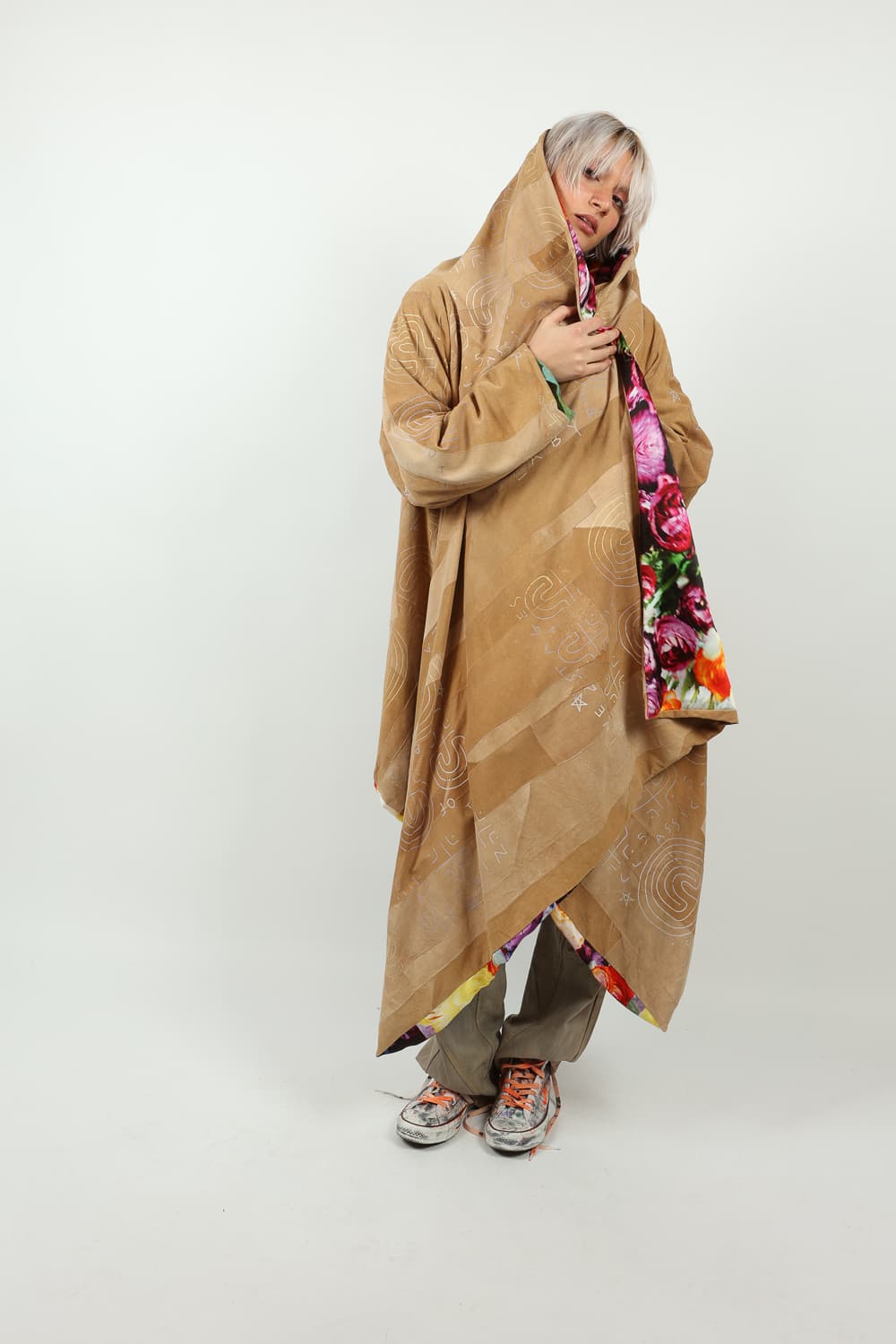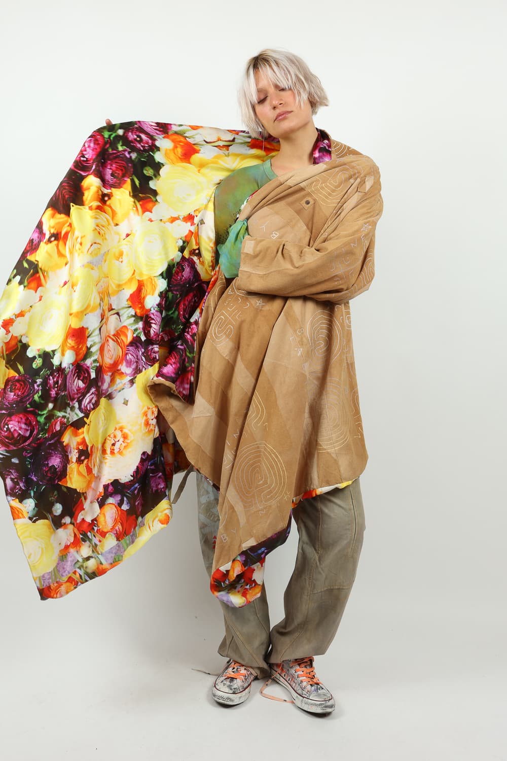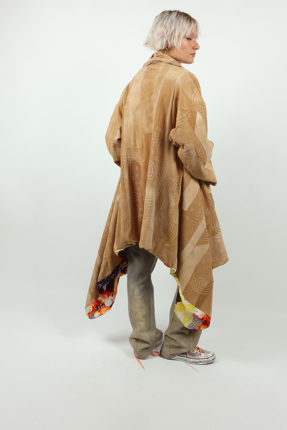 Recycled worked goatskin coat, hand screenprinted. Silk Satin digital photoprint lining. Onesize. 100% leather, 100% silk.