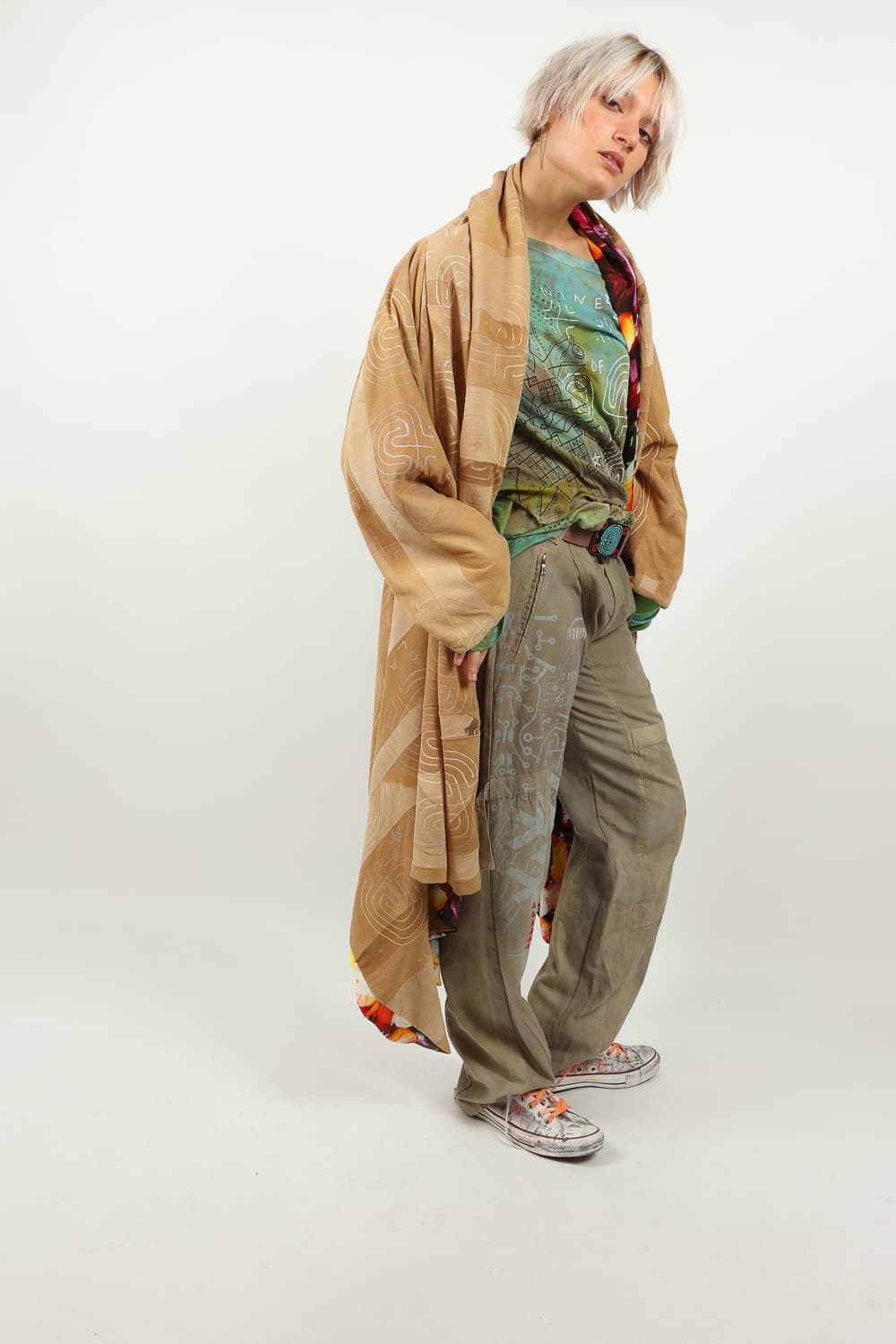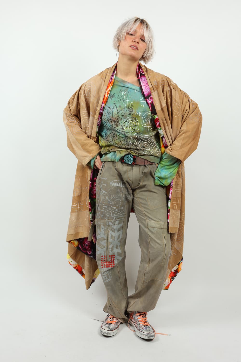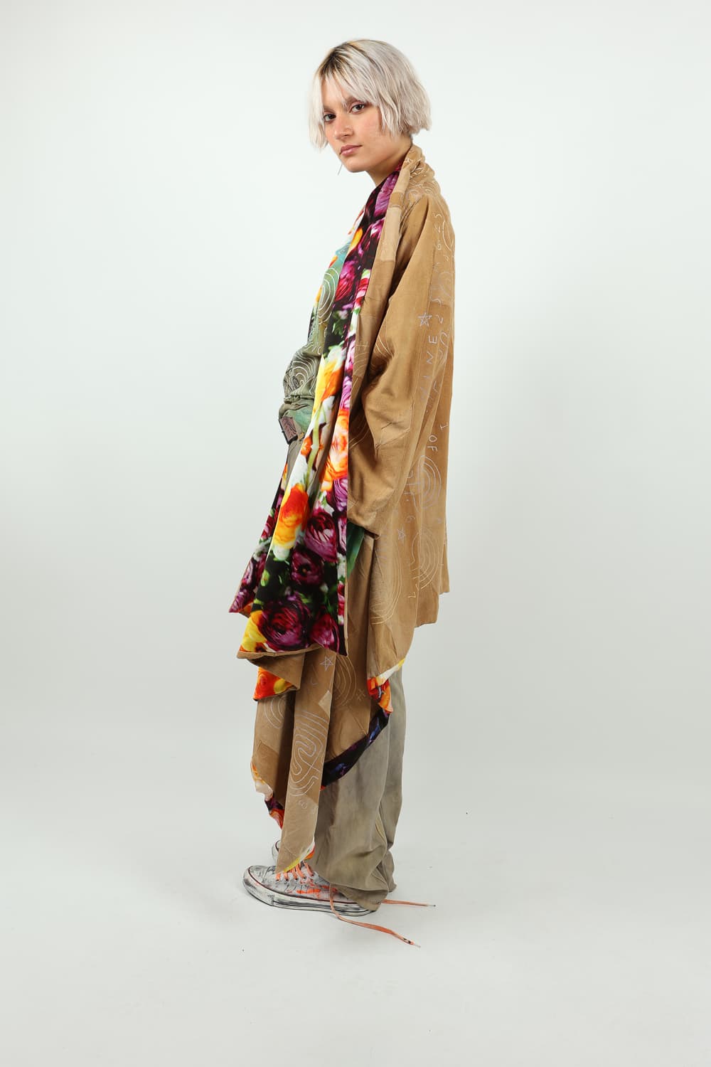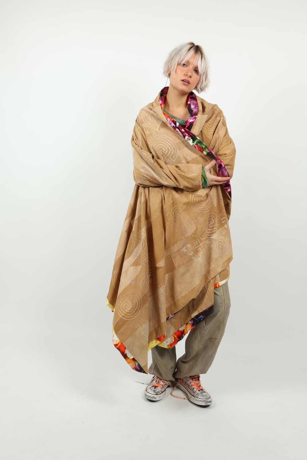 Recycled worked goatskin coat, hand screenprinted. Silk Satin digital photoprint lining. Onesize. 100% leather, 100% silk.