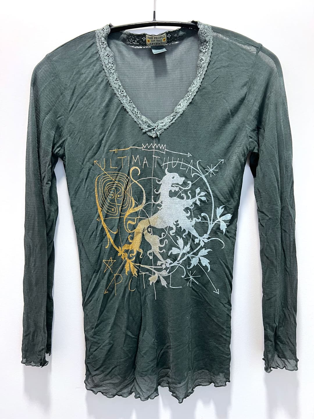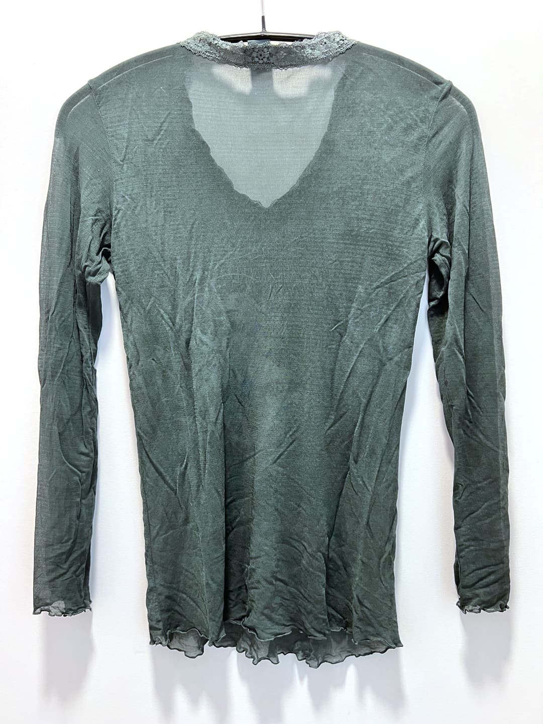Screen printed silk mesh longsleeve with a lace trimming around the neckline. Perfect for layering. 100% silk.