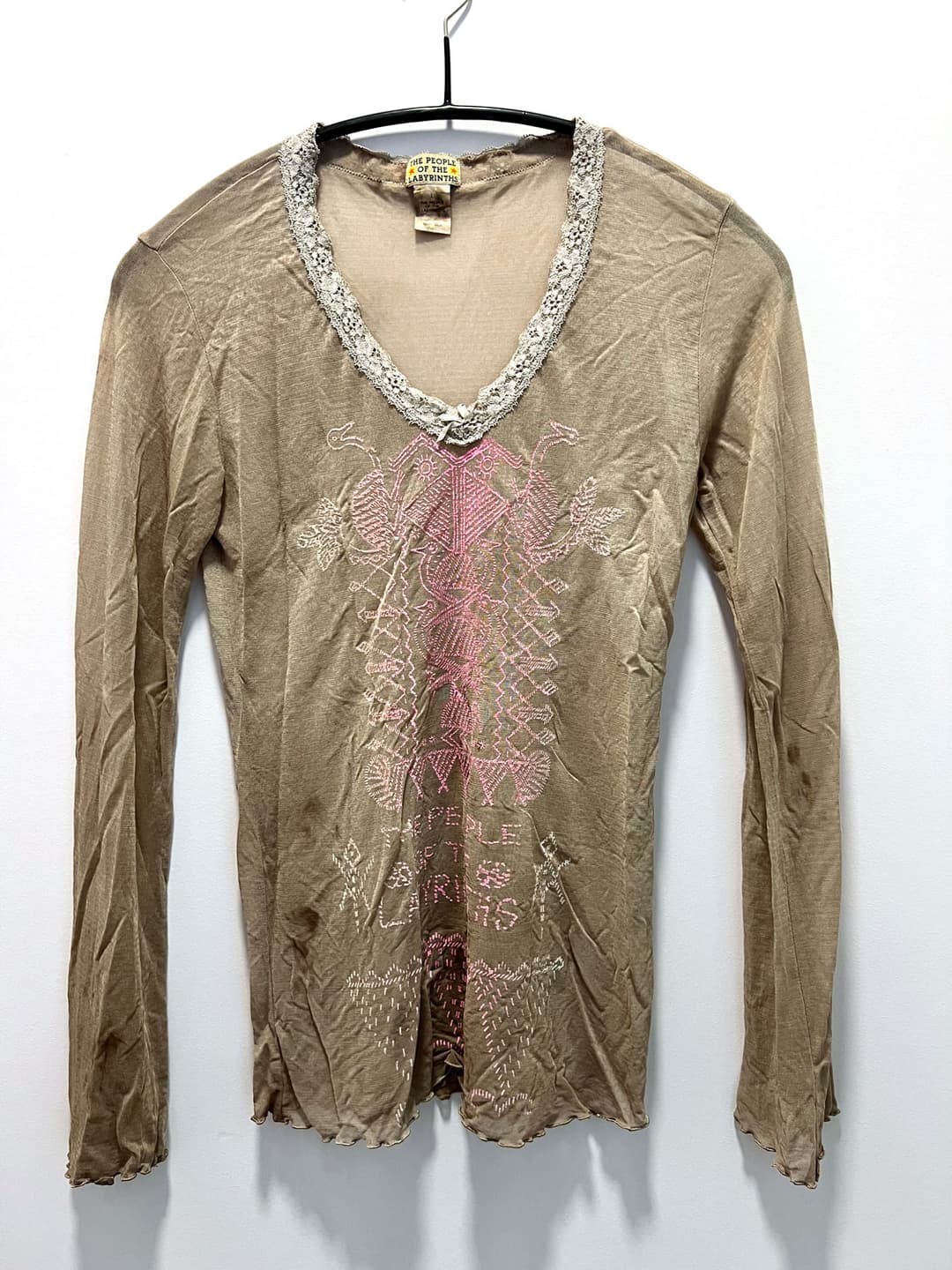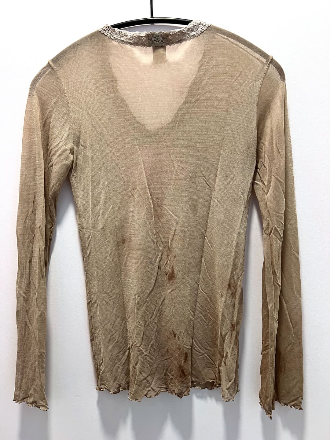 Screen printed silk mesh longsleeve with a lace trimming around the neckline. Perfect for layering. 100% silk.