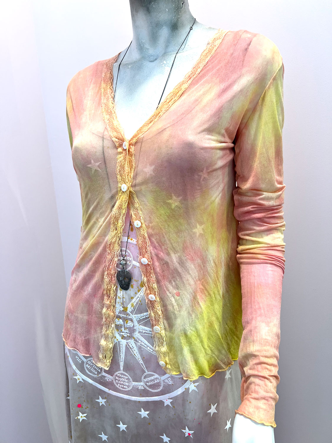 Hand dyed and screen printed silk mesh cardigan with lace trimmings. 100% silk.