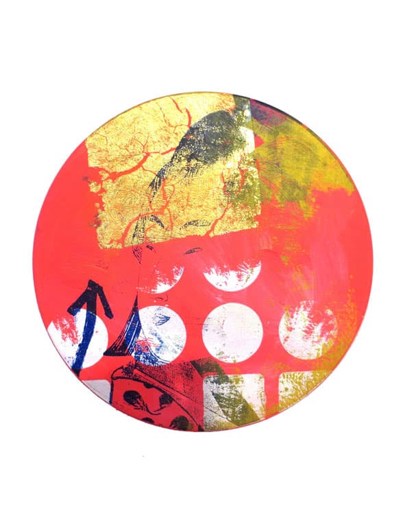 Mixed Media Painting. Acrylic paint on wood panel, screenprint and mixed media techniques + gold leaf. 30 x 30 cm. For more info please contact the POTL Store Amsterdam.