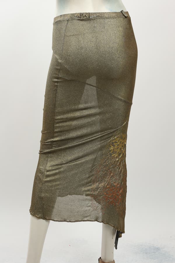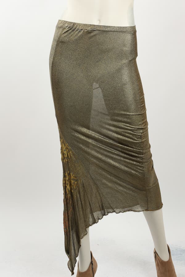 This gold jersey skirt is a true eye-catcher for a party. A-symmetrical design with queue. 100% viscose.