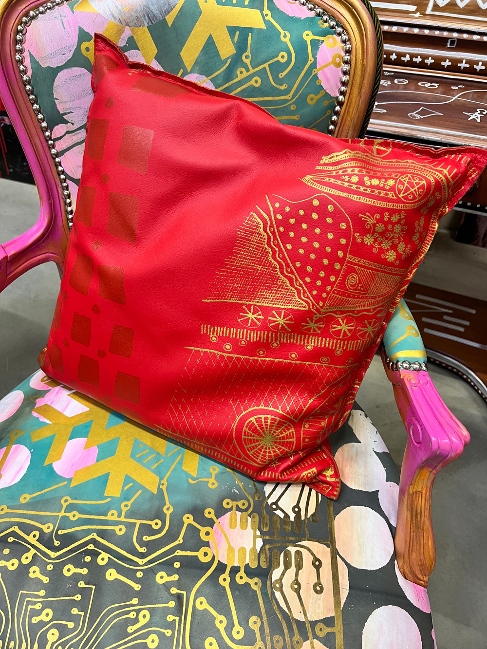 Medium sized leather pillow with screen print. 45x45 cm. 100% Leather.
