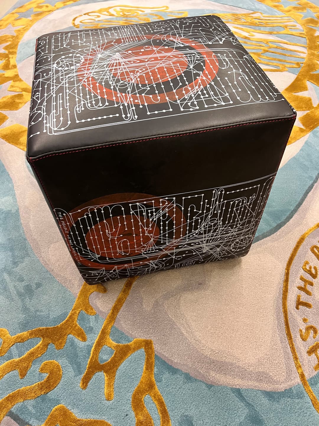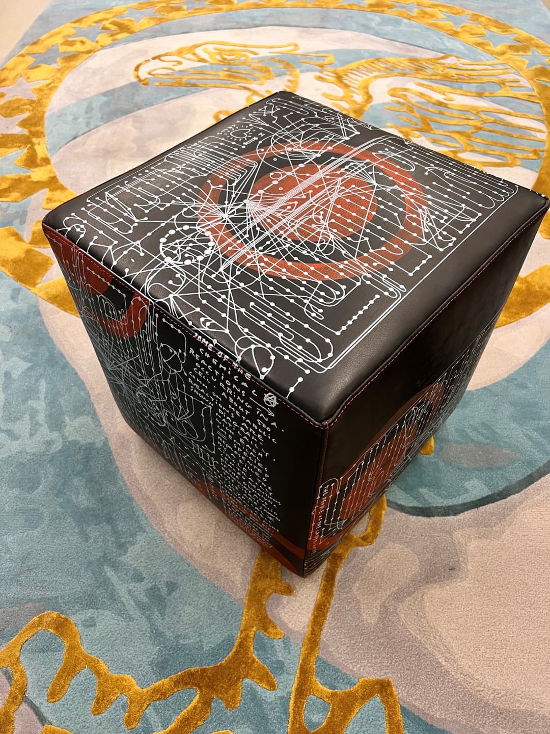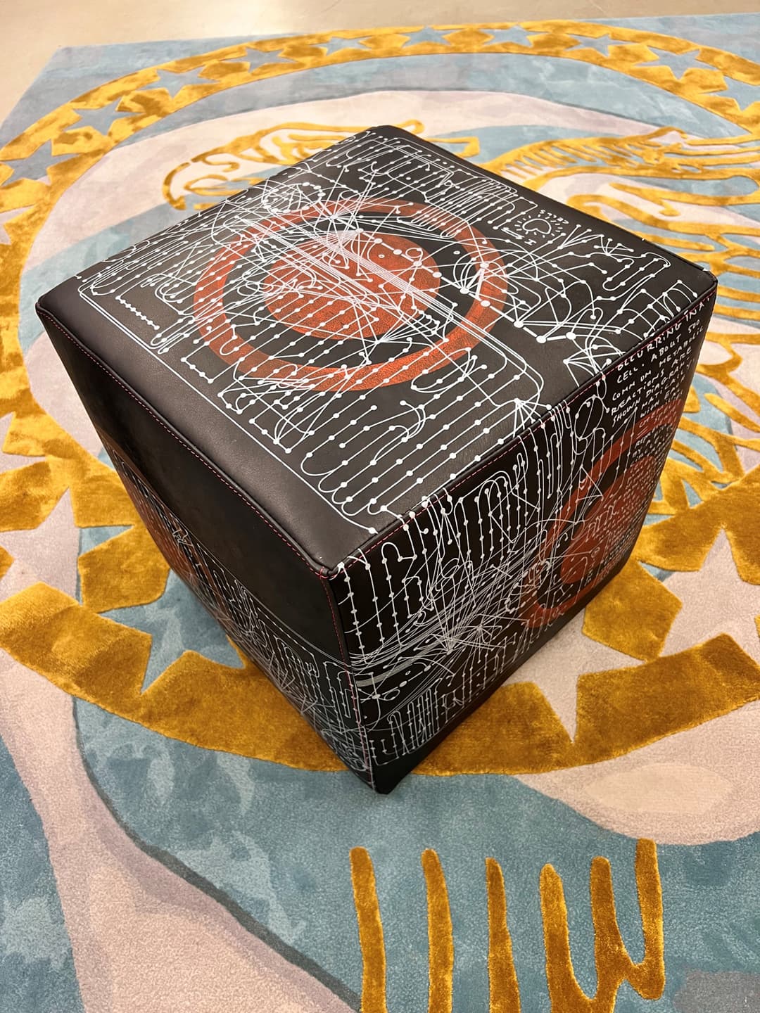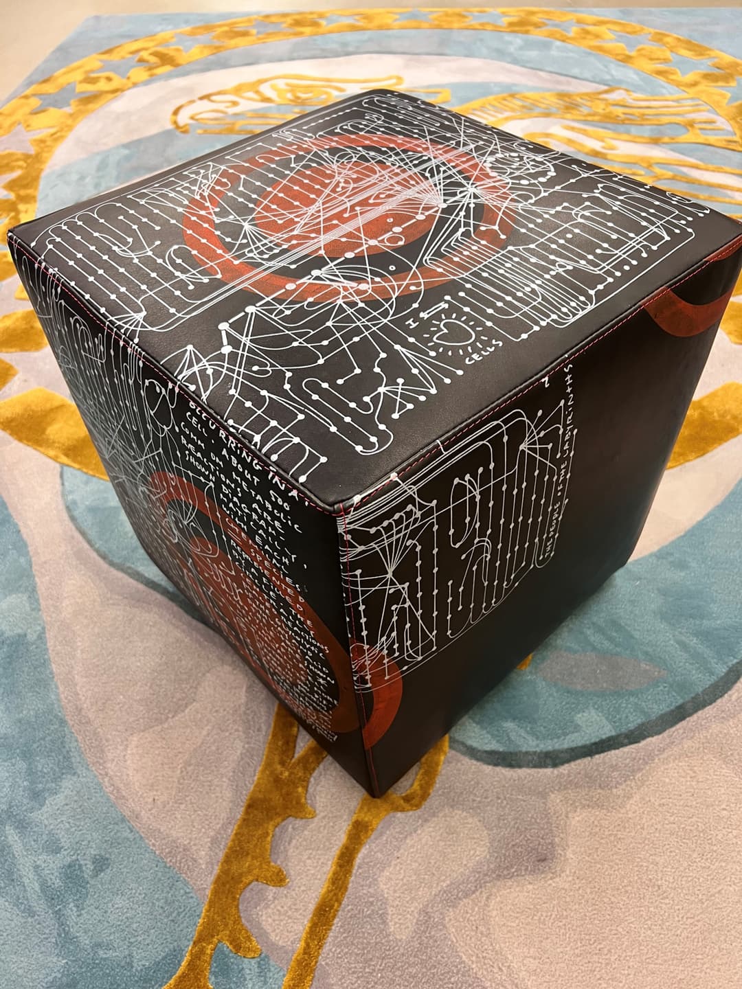 Ottoman upholstered with 100% leather. Pre-dyed and screen printed by hand. Size: 40 x 40 x 45 cm.
