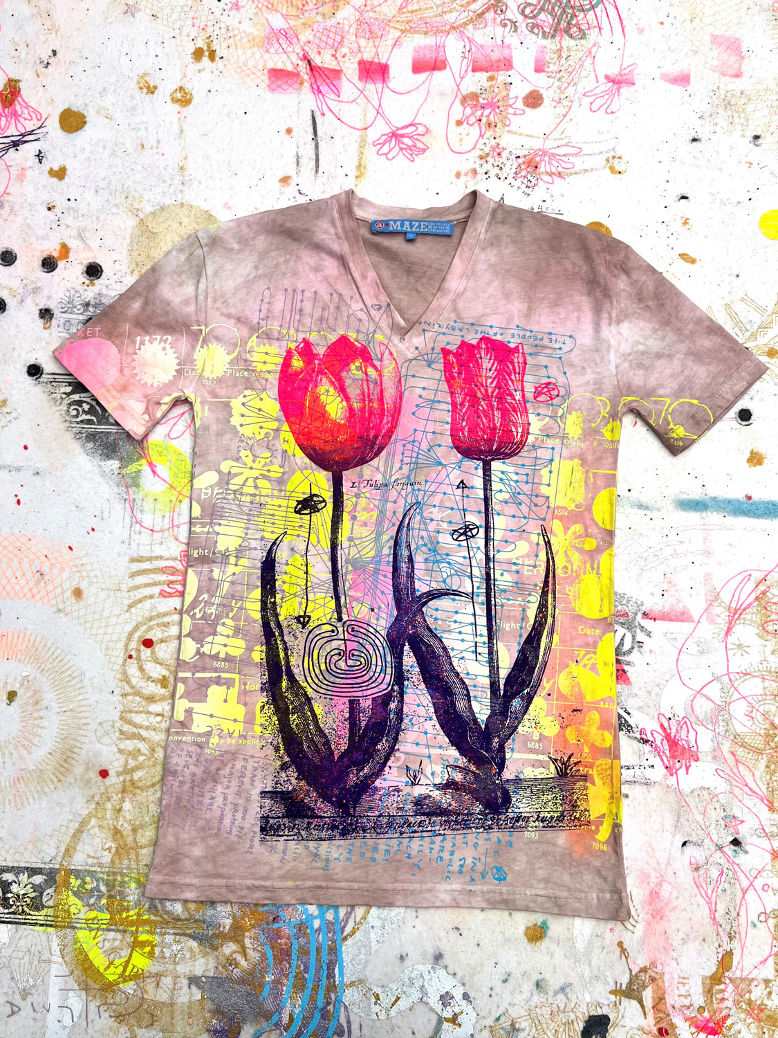 Hand dyed and screen printed cotton t-shirt with V-neck. 100% cotton. Every piece is unique.