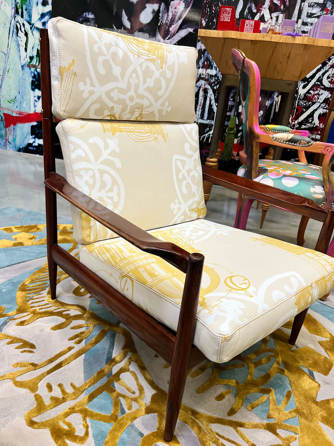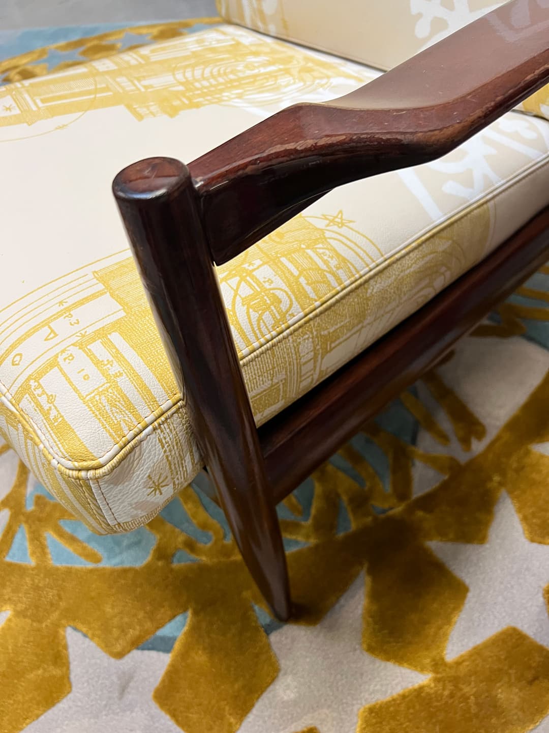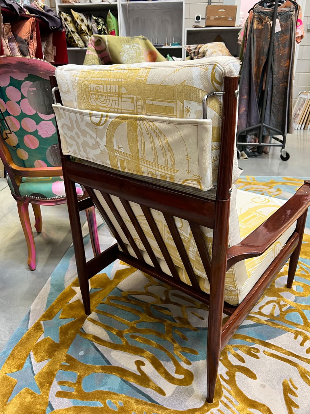Mid century original italian design chair, refurbished with POTL hand printed leather upholstery.